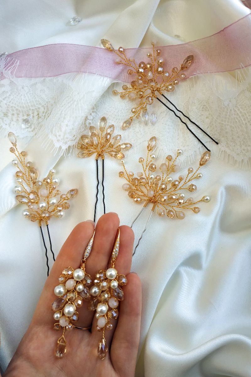 У комплект до сережок є кілька видів шпильок (фото 5). Також можна виготовити по вашим побажанням гребінь / гілочку для волосся, браслет, кулон / кольє.