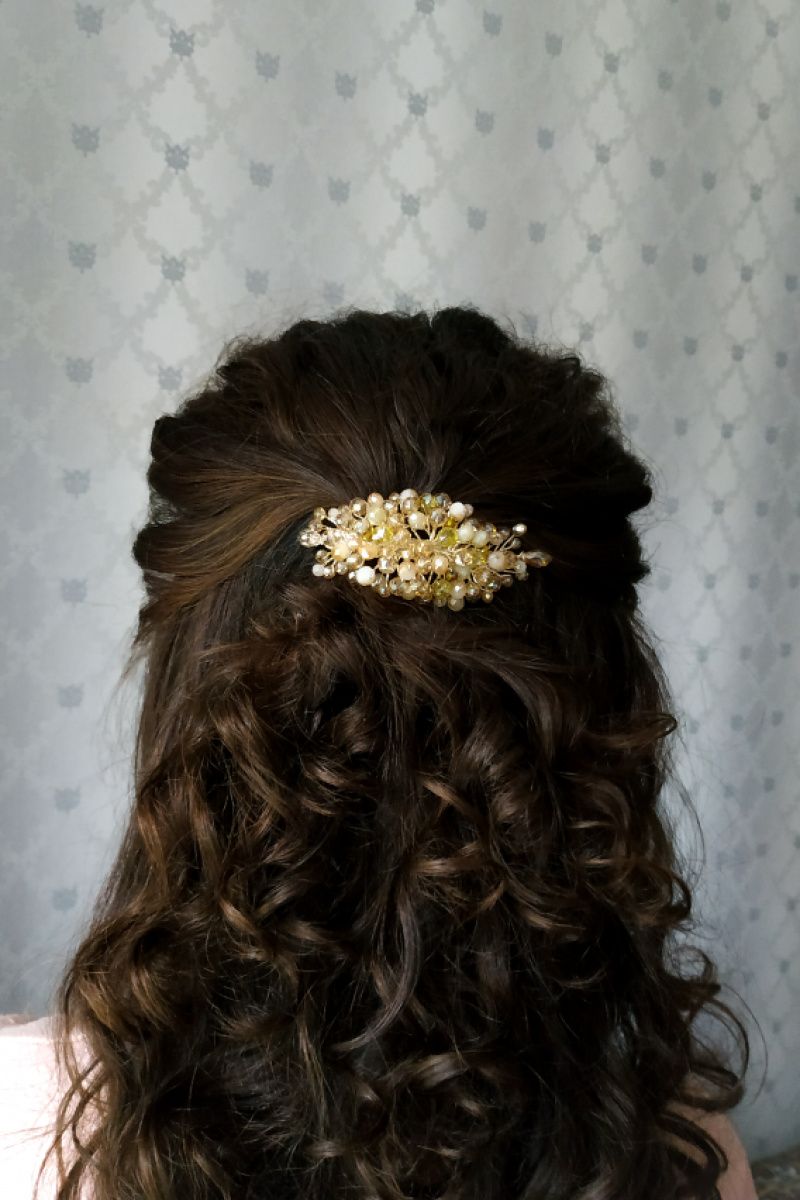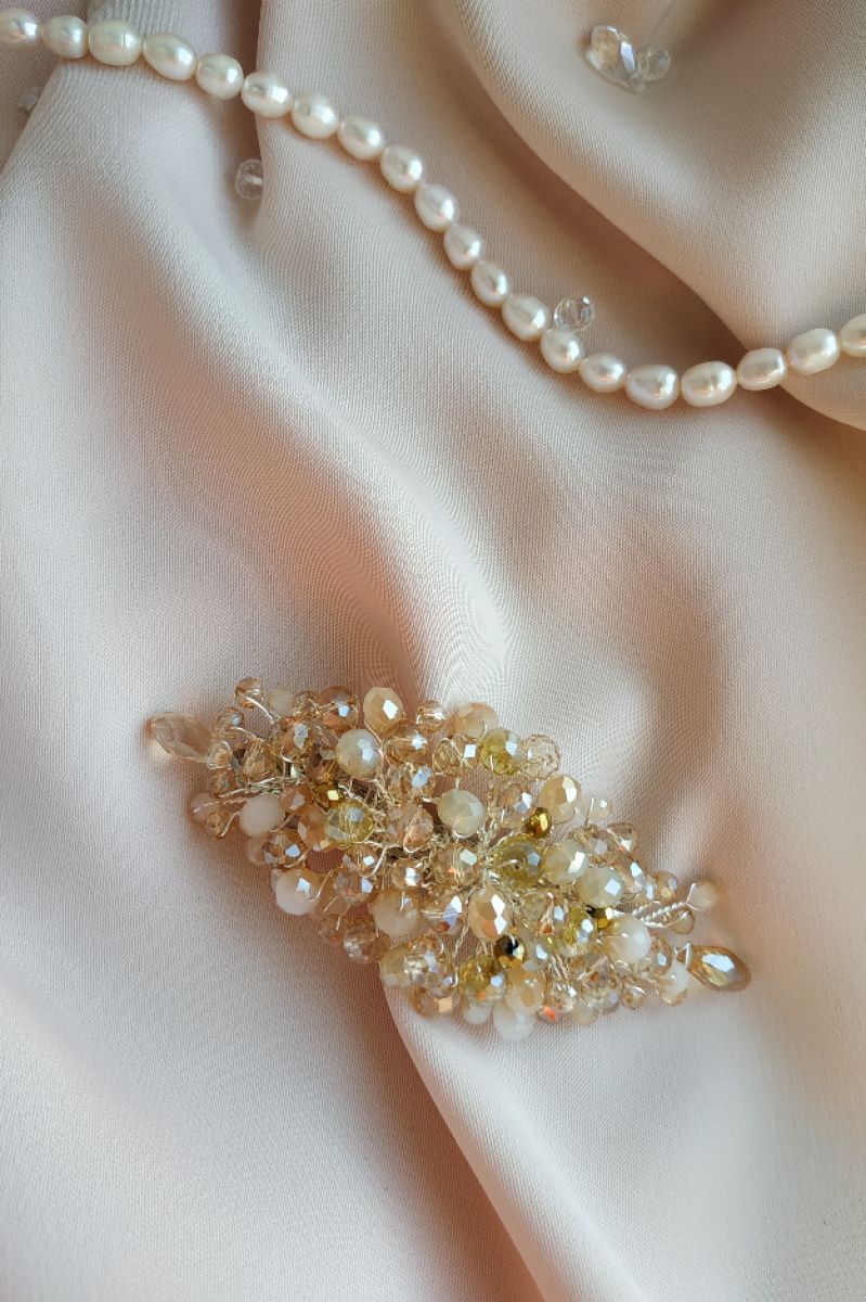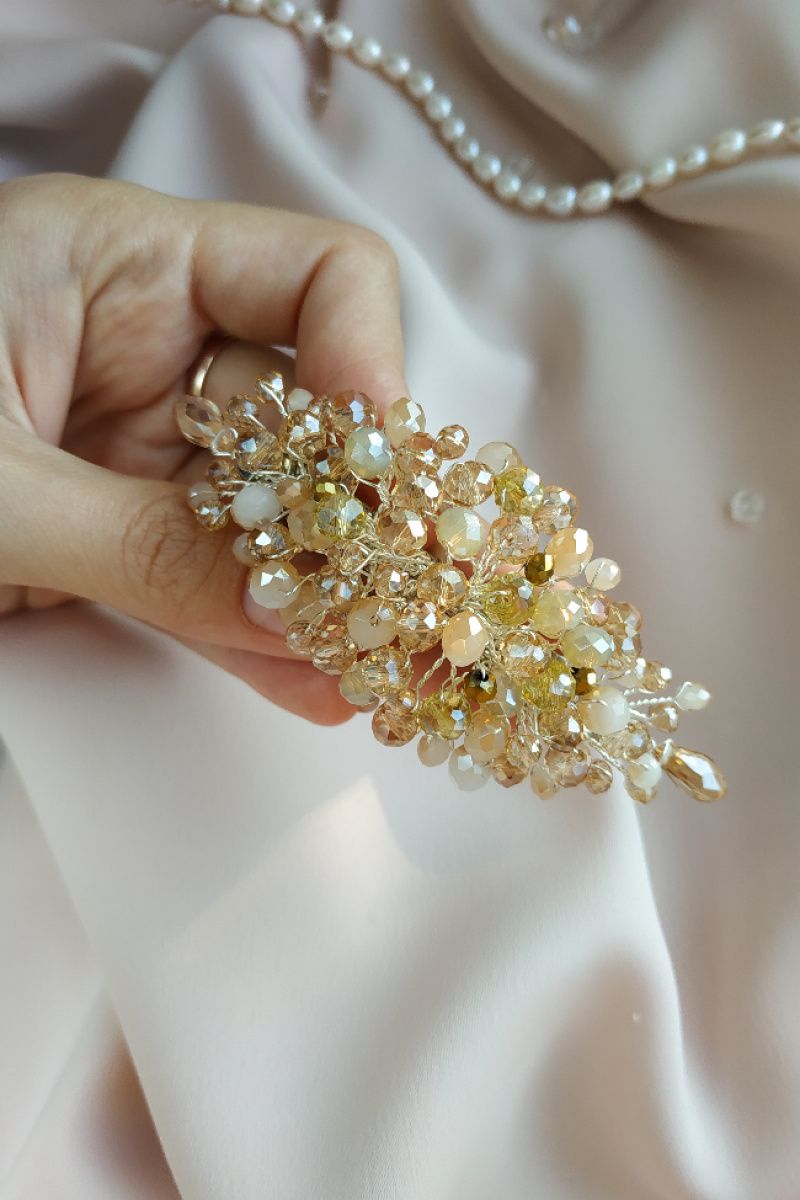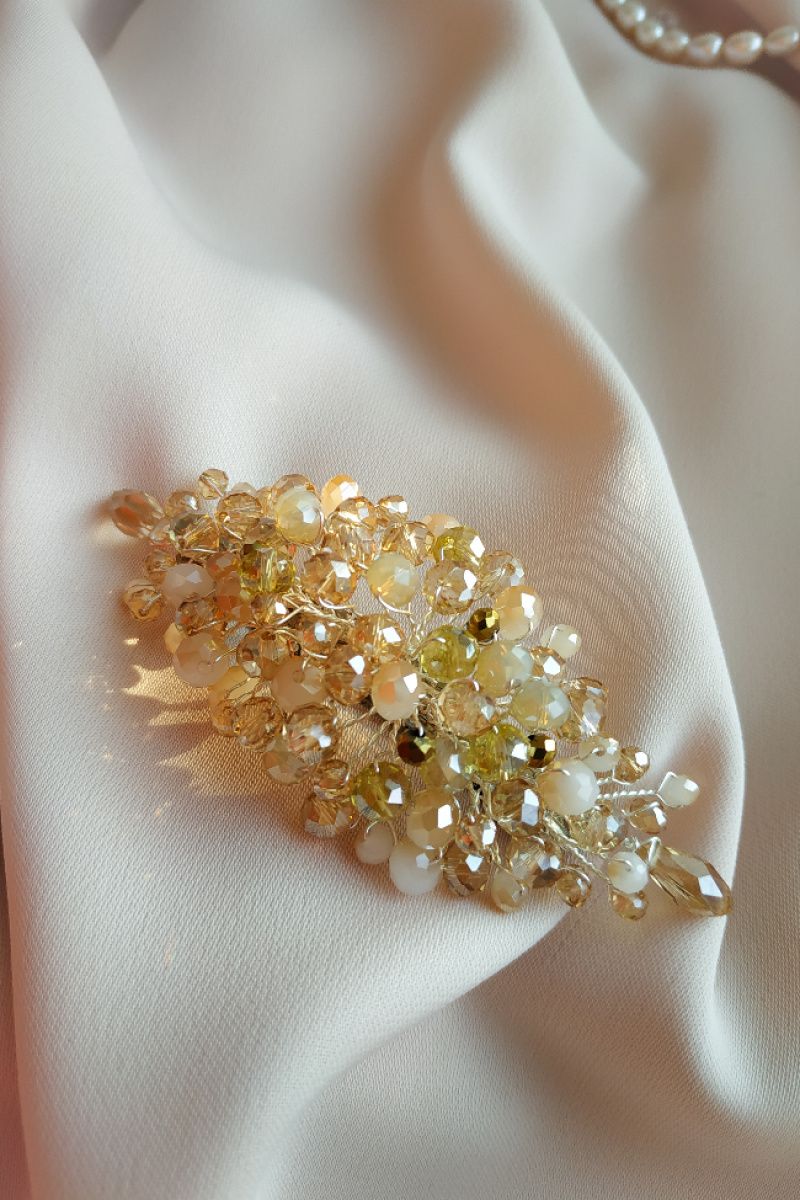Універсальна сяюча шпилька-автоматик в кольорі шампань з вкрапленнями намистин золотого кольору
