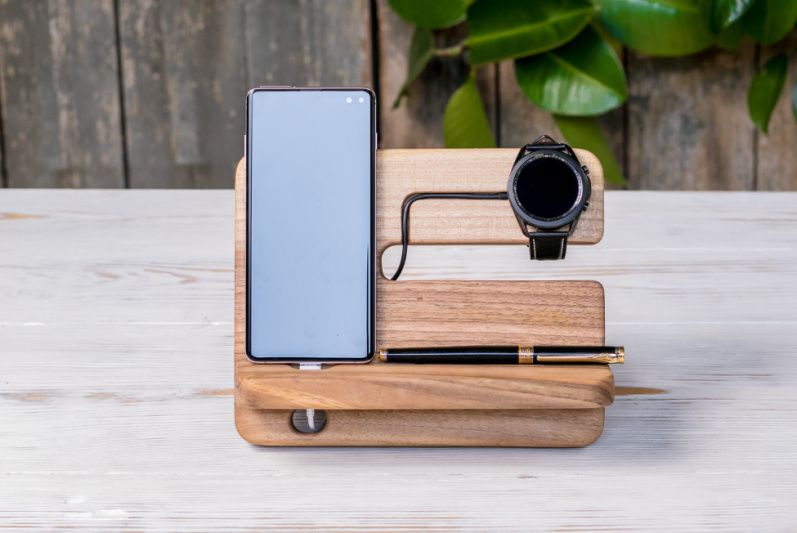 Уявіть собі - поєднуючи дві деталі між собою, Ви формуєте стильний органайзер як для чоловіків, так і для жінок. Оригінальність цього аксесуара полягає в тому, що тут знайдеться місце для годинника Samsung і браслетів, які можна стильно розмістити в правому верхньому куті аксесуара. Трохи нижче можуть бути розміщені Ваші візитівки. Зліва - місце для Вашого Samsung Galaxy, який можна заряджати, не знімаючи з органайзера завдяки зручному отвору для проводів. А на зворотному боці підставки знайдеться місце для гаманця, ключів, ручок та інших необхідних речей кожної сучасної людини.
