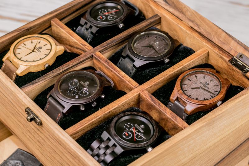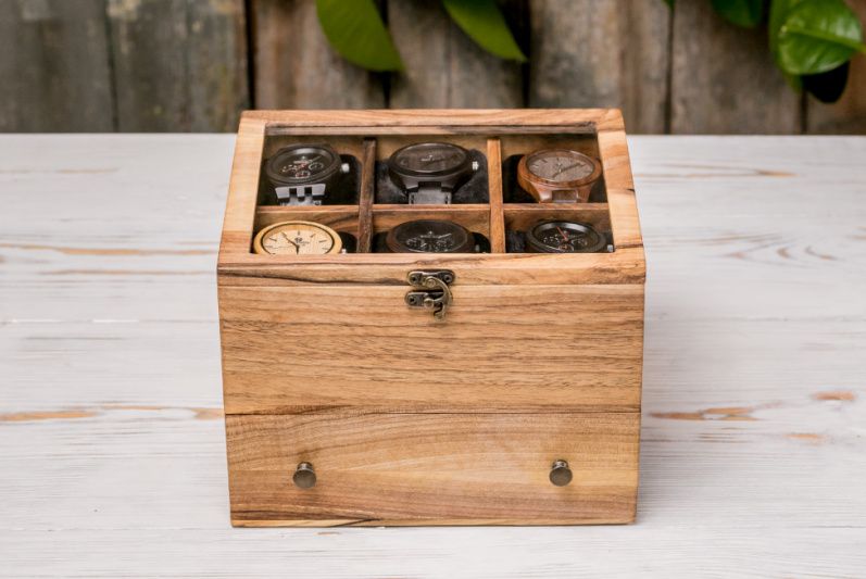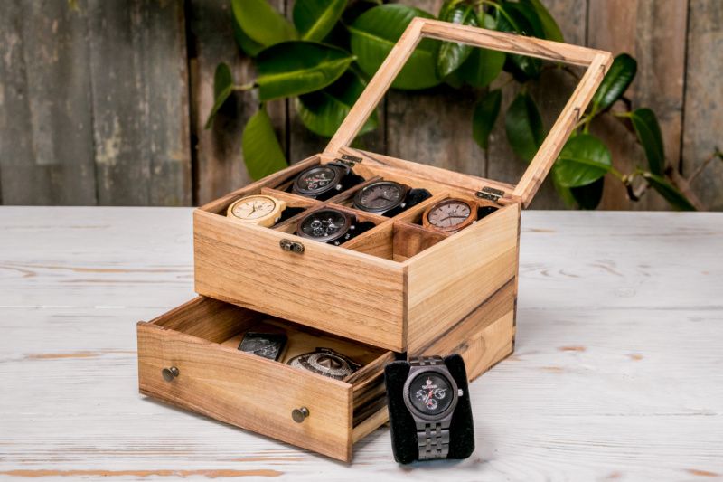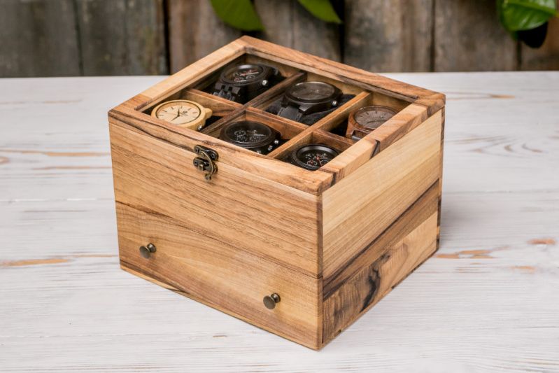 Дерев'яний органайзер для годинників з ящиком - незамінний аксесуар. Не так просто знайти затишне місце для всіх щоденних аксесуарів - наручного годинника, запонок, ремінців, браслетів, метеликів і окулярів. Спеціально для цього ми розробили органайзери з дерева для зберігання всіх Ваших аксесуарів в одному місці. Розмір нижньої шухлядки в залежності від кількості годинників відрізняється по ширині, але однаковий по глибині і висоті, розмір відділення для годинників стандартний - 60х80х65мм. Подушечки для годинників зроблені з велюру і йдуть в комплекті з дерев'яною коробочкою. Стандартні позиції розраховані для 4, 6, 8, 10 і 12 годинників.