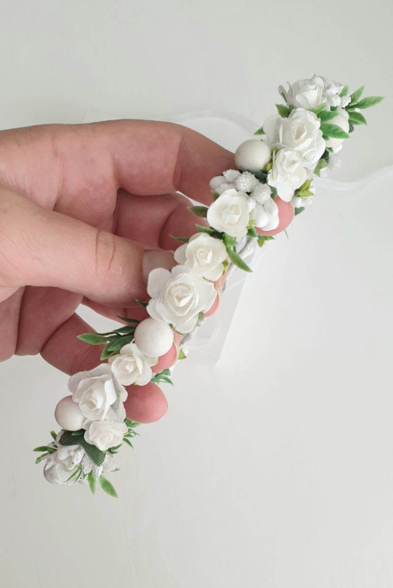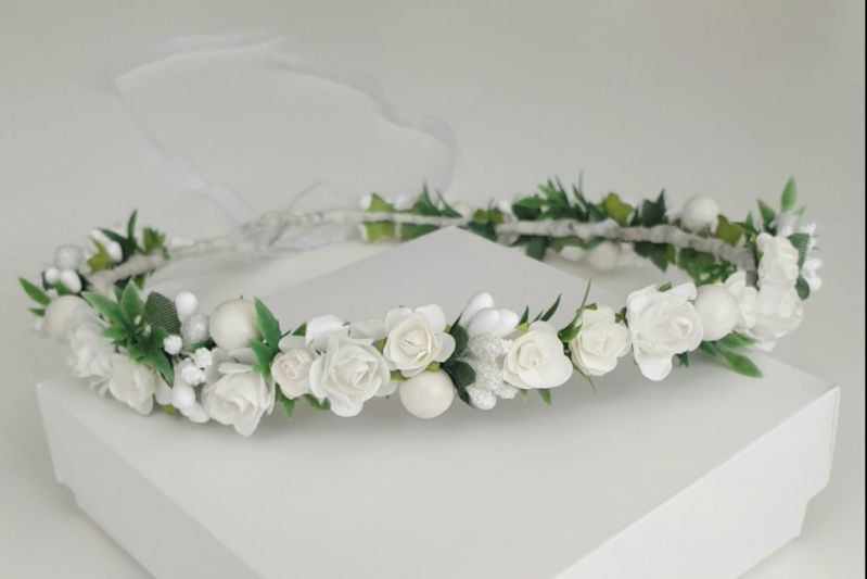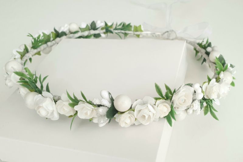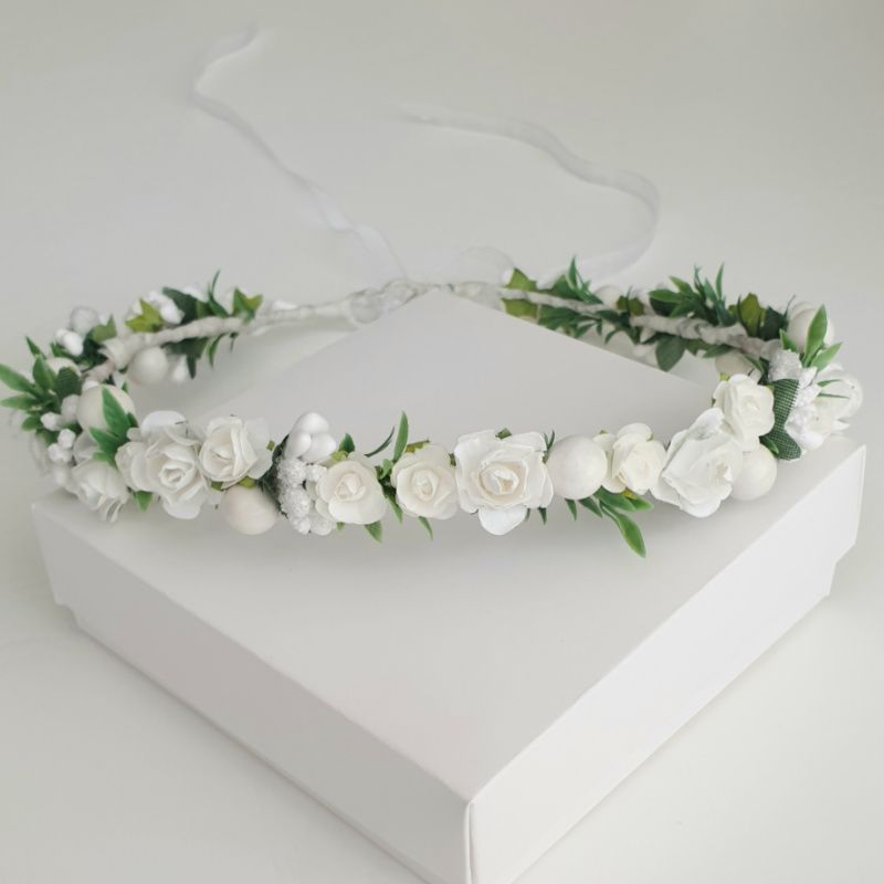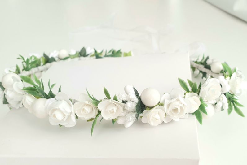 Віночок створений з білих паперових квітів: білих ягідок та зелених листочків