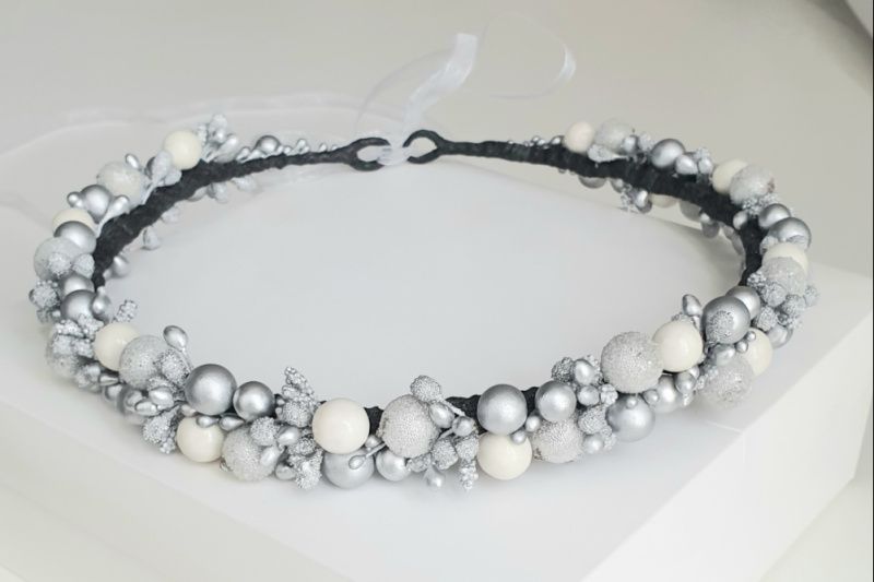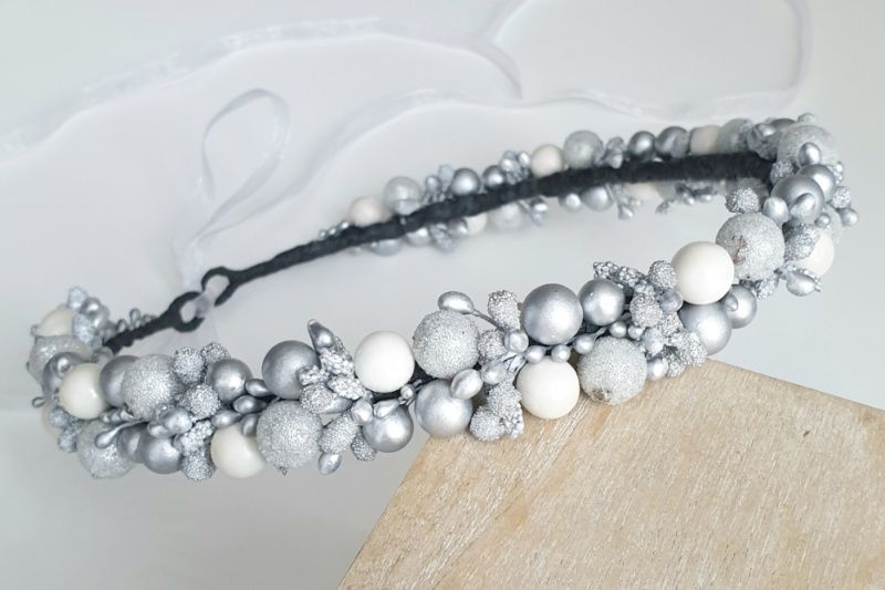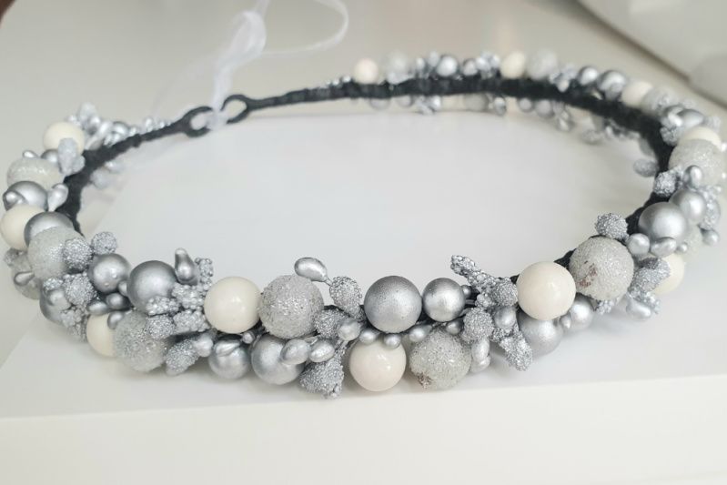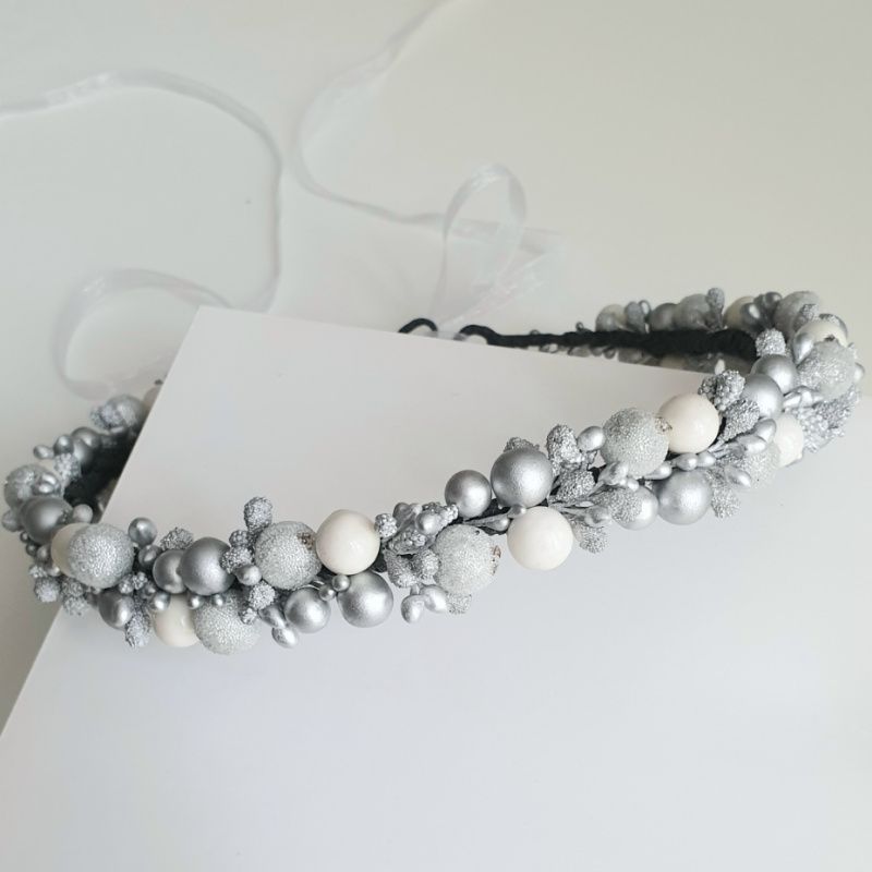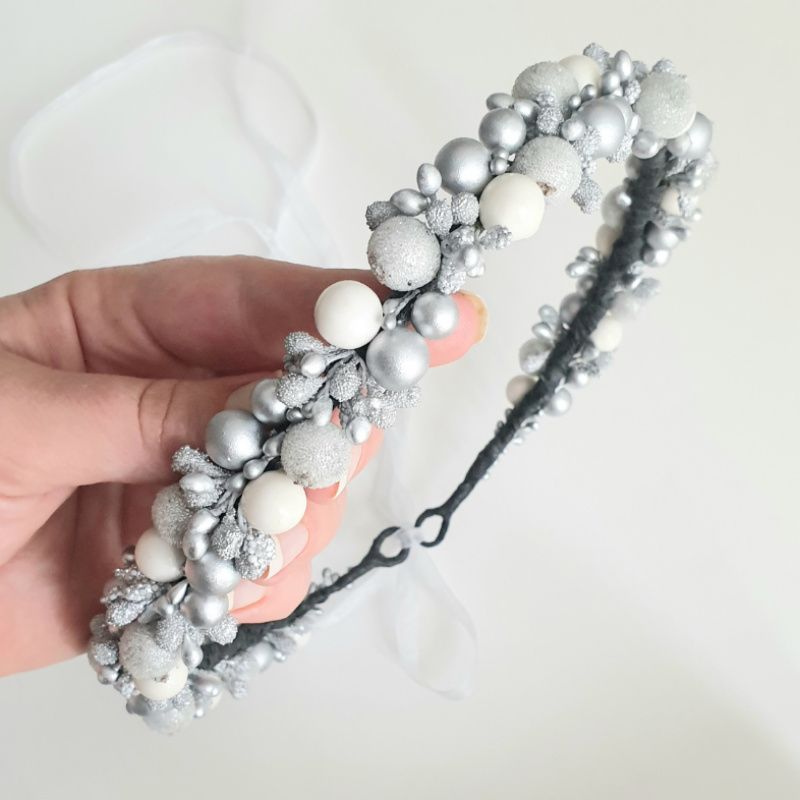 Віночок "Засніжена Ягідка" виготовлений з ягідок та бруньок в сріблясто-білій гаммі