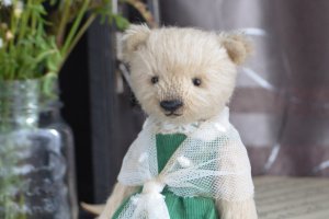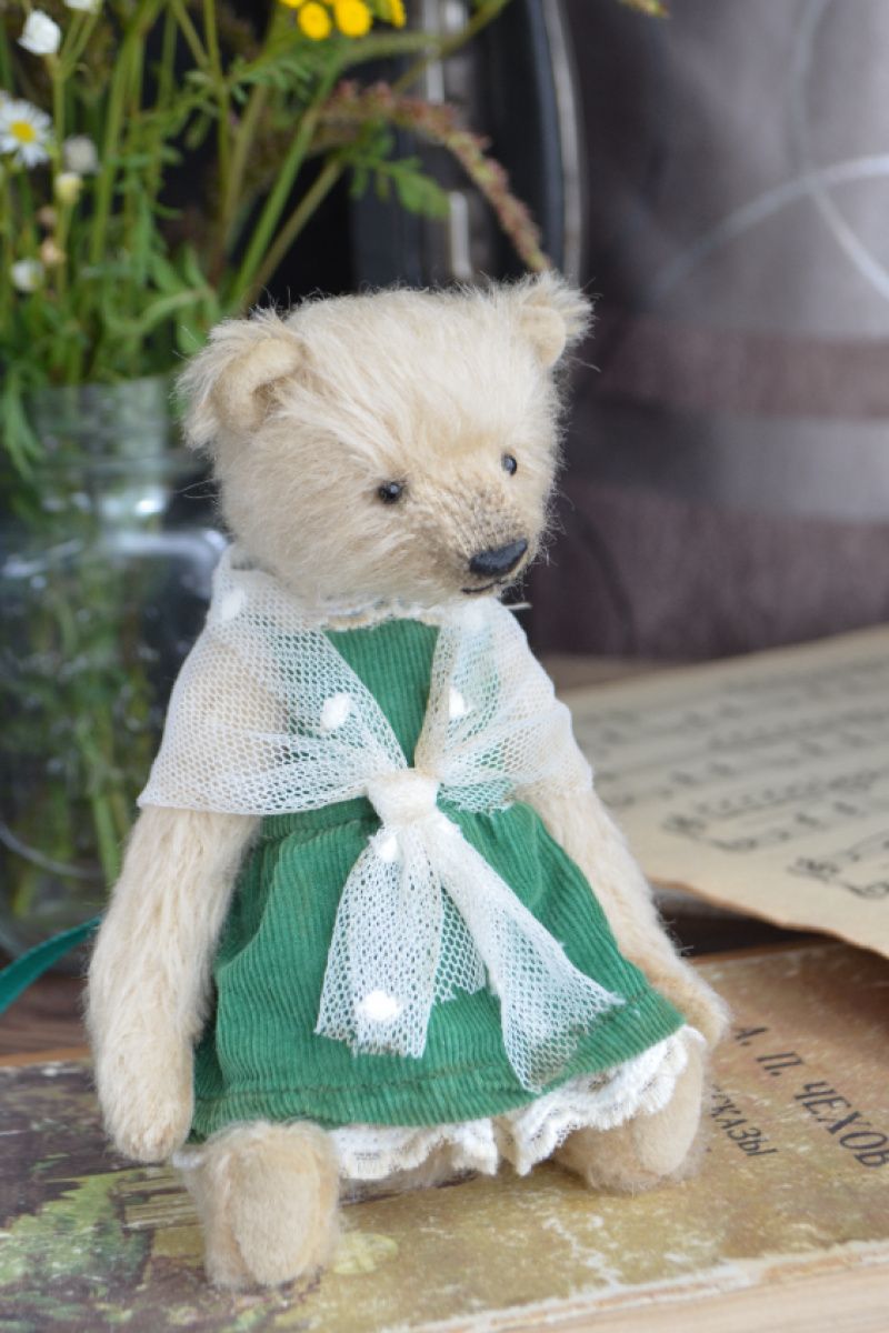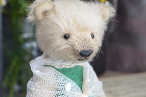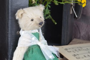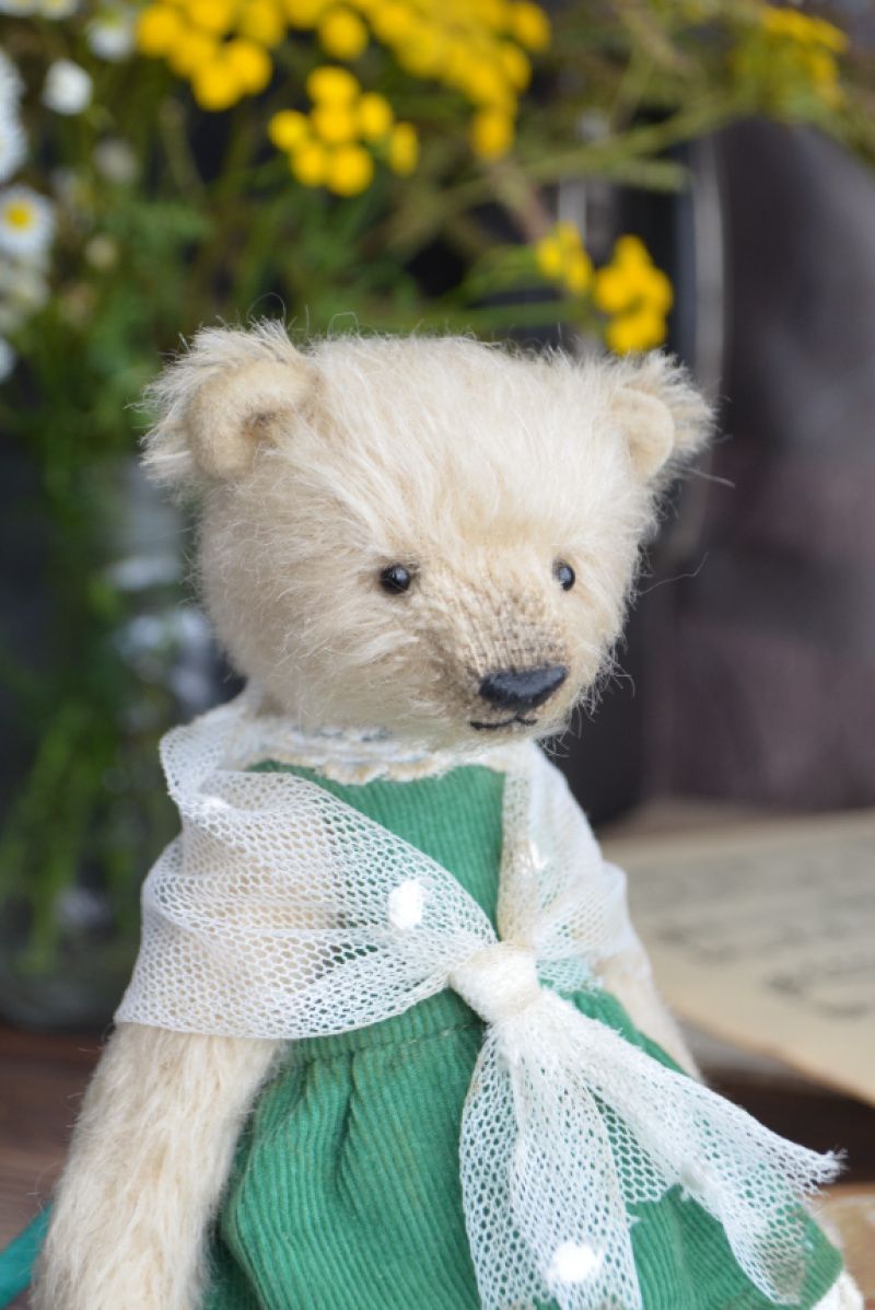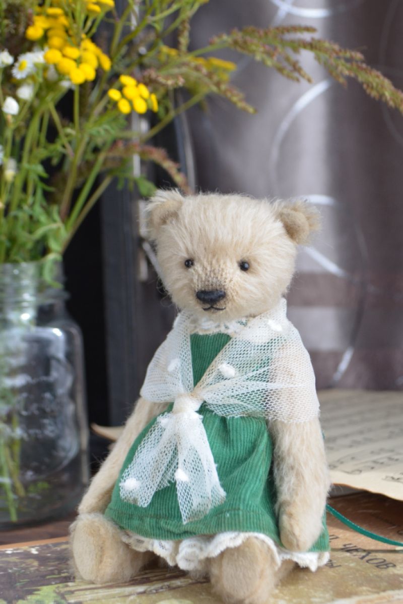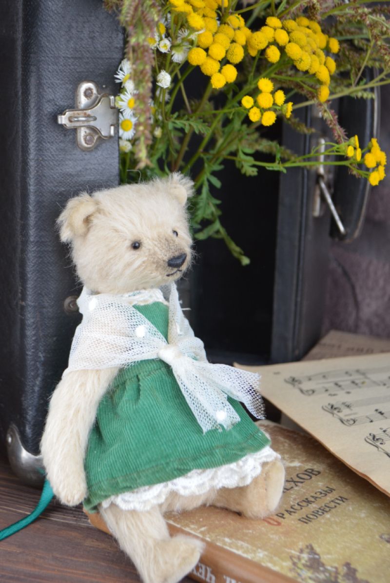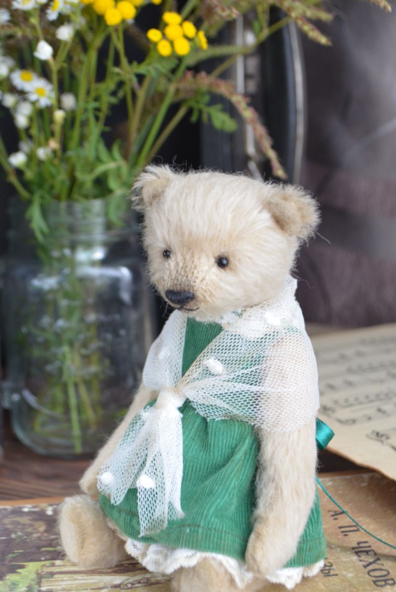 Мишка Габріель зшита в техніці Тедді. Матеріал - мохер, набита опілочкамі, все кріплення рухливі. Голова на петельному кріпленні, гойдається. Футболка вельвет, тонування і состаривание маслом. Усередині утяжелена метал. гранулятом. Повний зріст 20 см, сидячи 14 см.