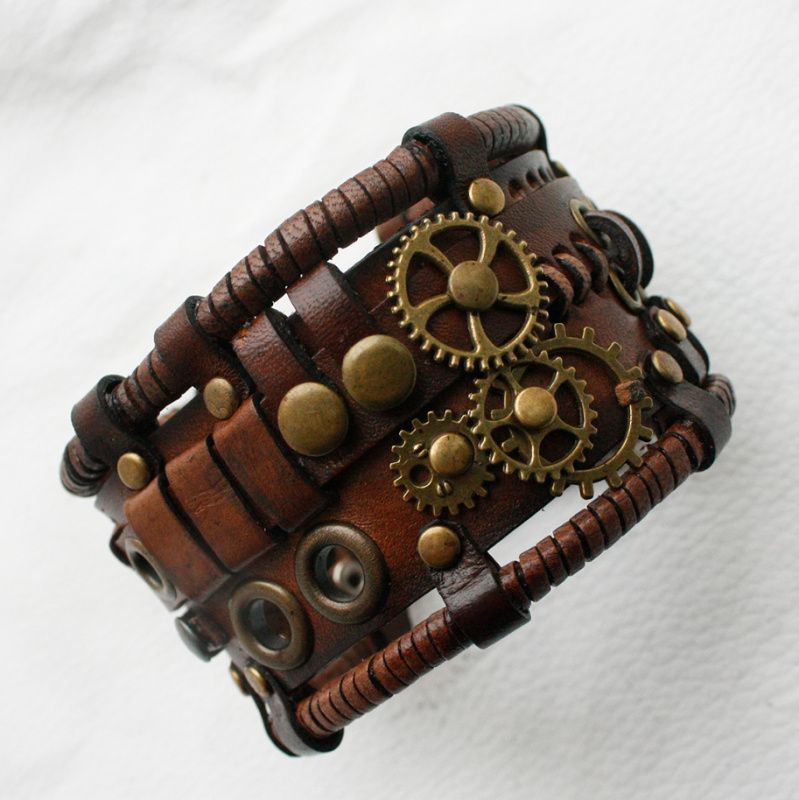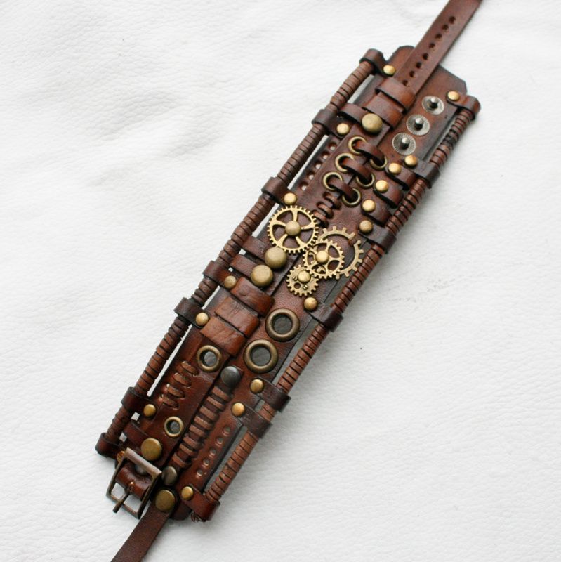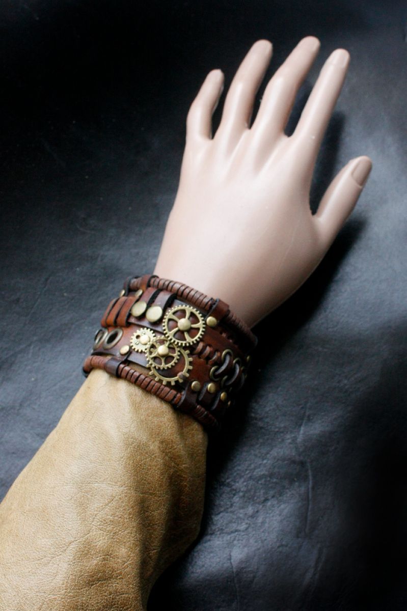 браслет з натуральної шкіри рослинного дублення в стилі стимпанк обхват руки 18-20см