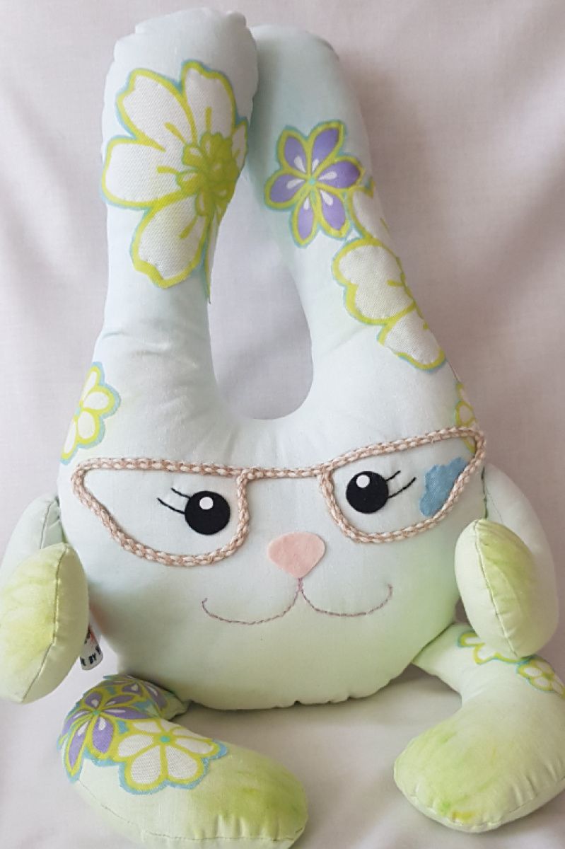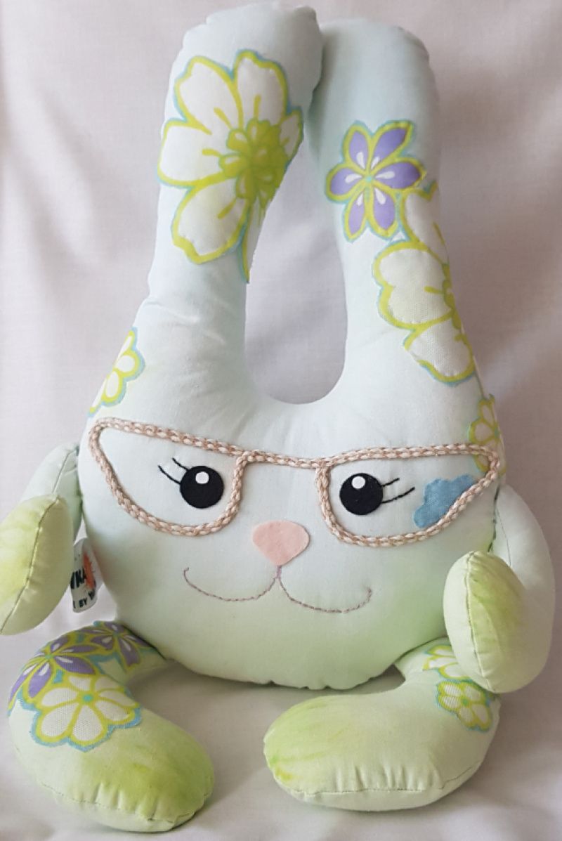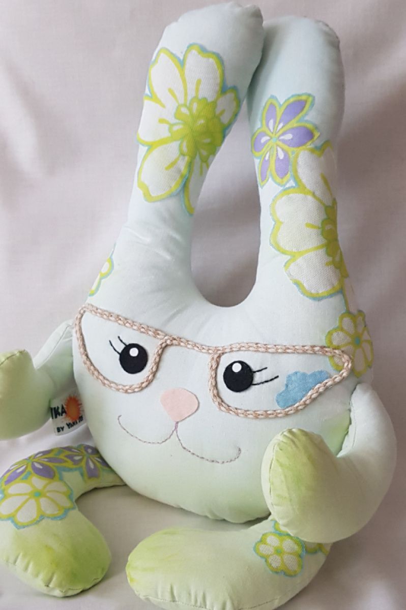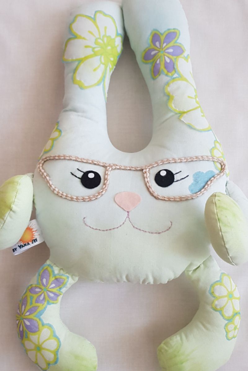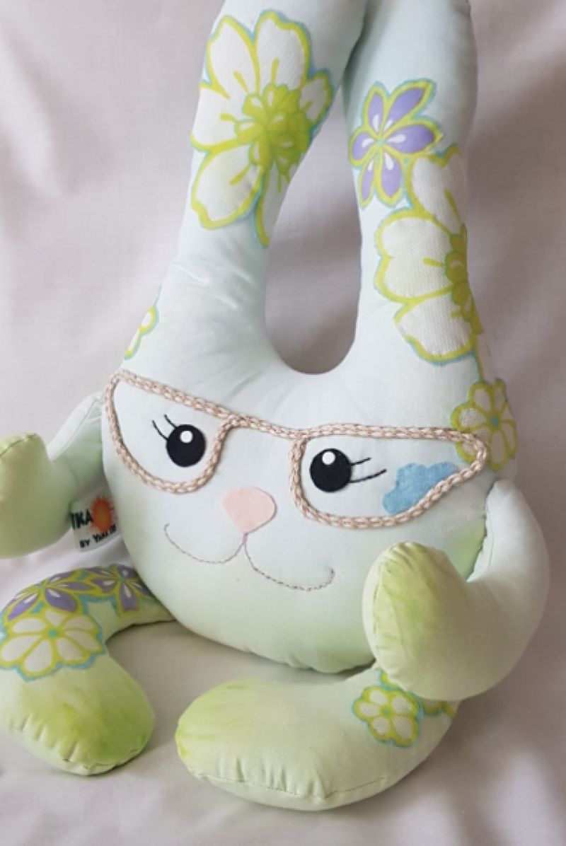 Авторская ручная работа, сделана с теплом и любовью. Ткань слегка тренировалась от светло- голубого (ушки) к платному (лапки). Высота 33см, ширина 24см. Материалы: коттон, холлофайбер.