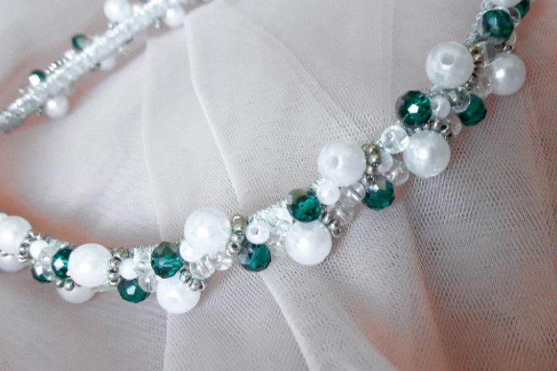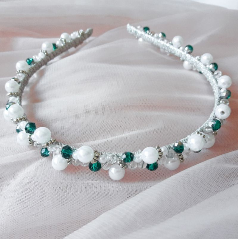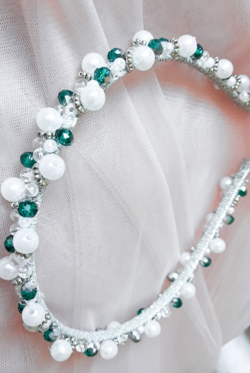 Обруч вишитий намистинами та бісером. В роботі використані кришталеві намистини, намистини з акрилу і чеський бісер. Даний обруч чудово доповнить як весільний образ, так і вечерній.