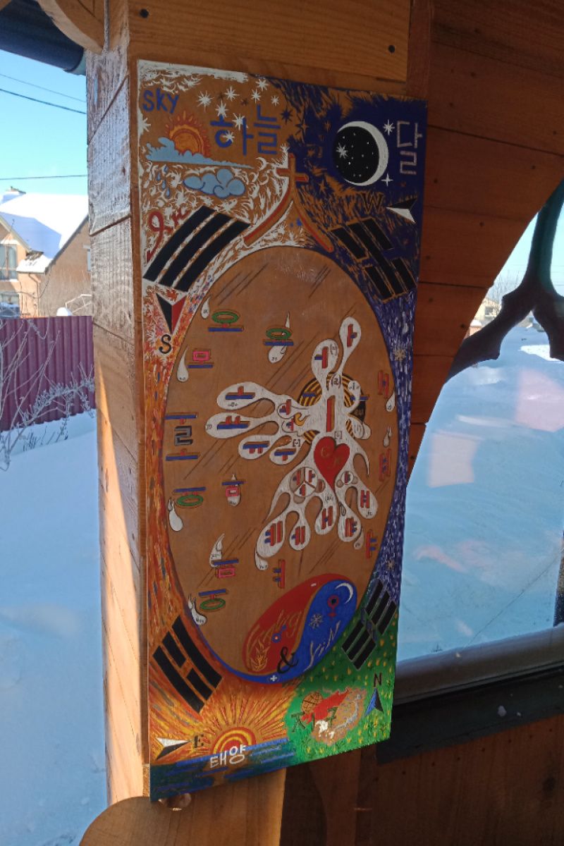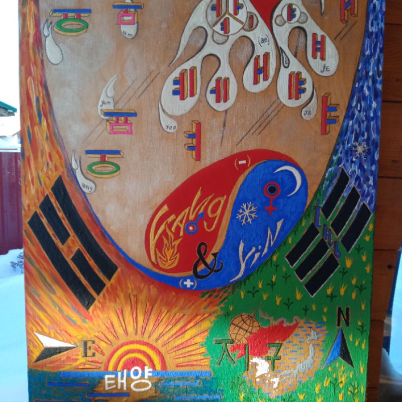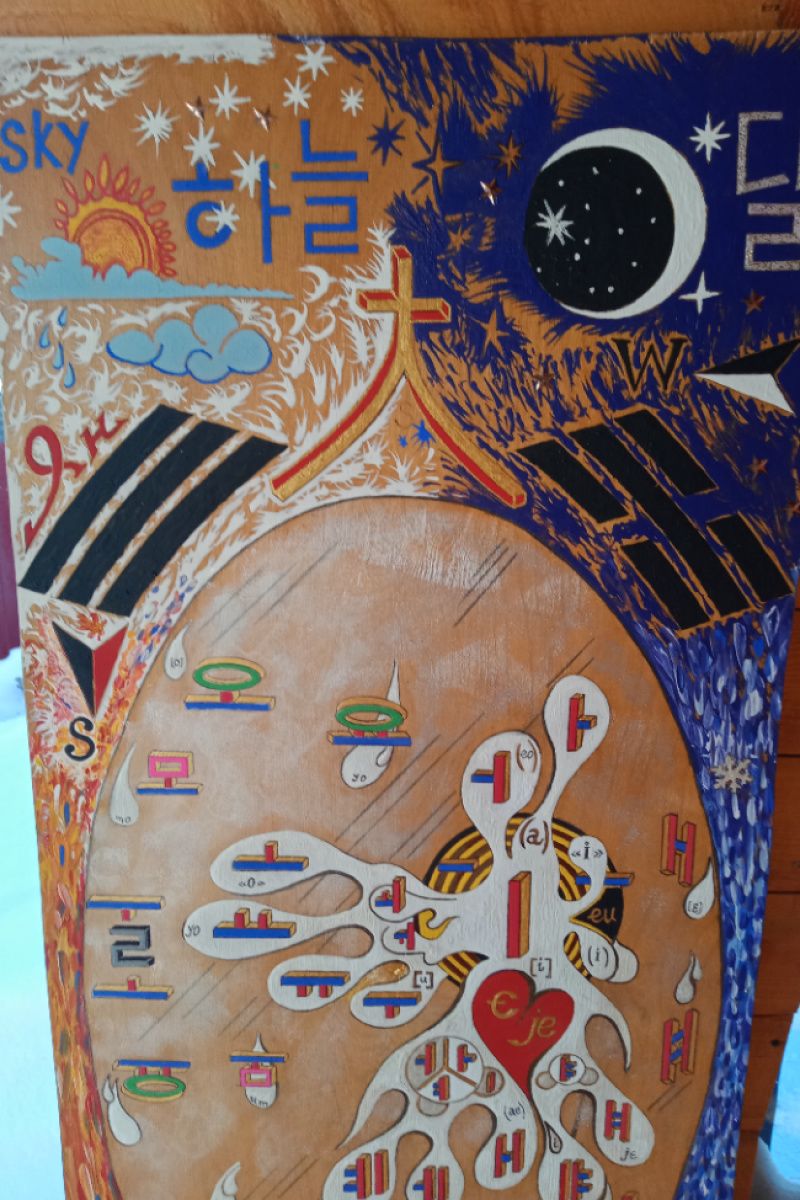 Задум картини "Кор. Дз." виник на основі абетки "Хангиль" , де є голосні , які вважаються дзеркальними за виглядом чи написанням .