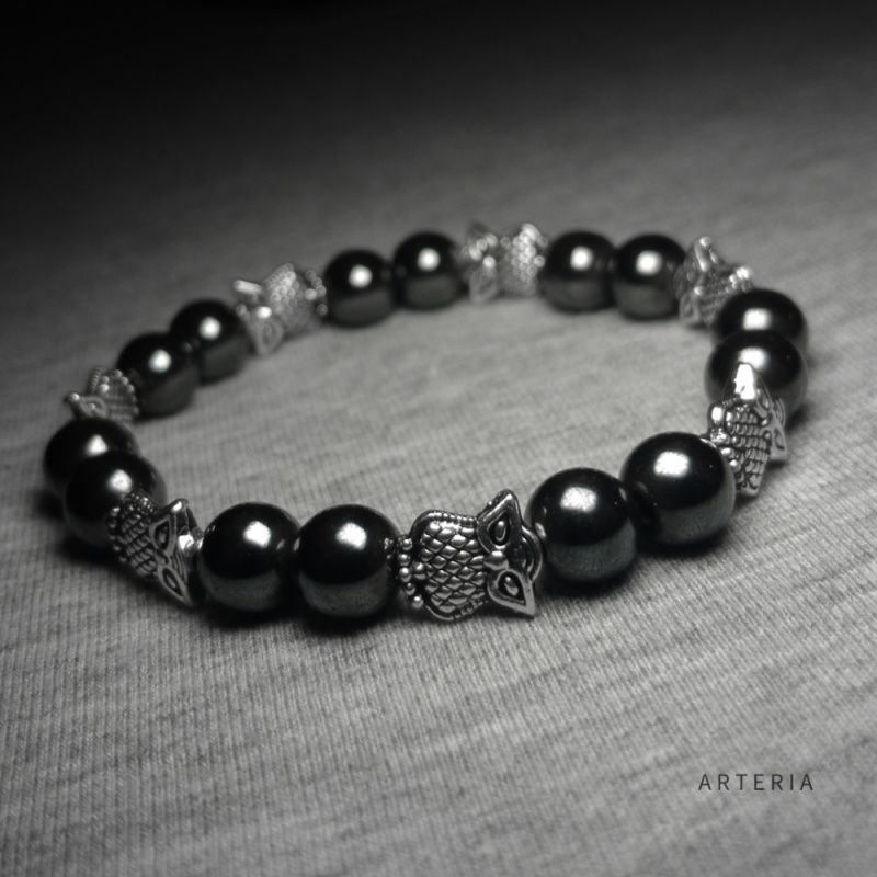 Браслет з гематиту (розмір намистини 8 мм) зі вставками сріблястого кольору «Совушка».