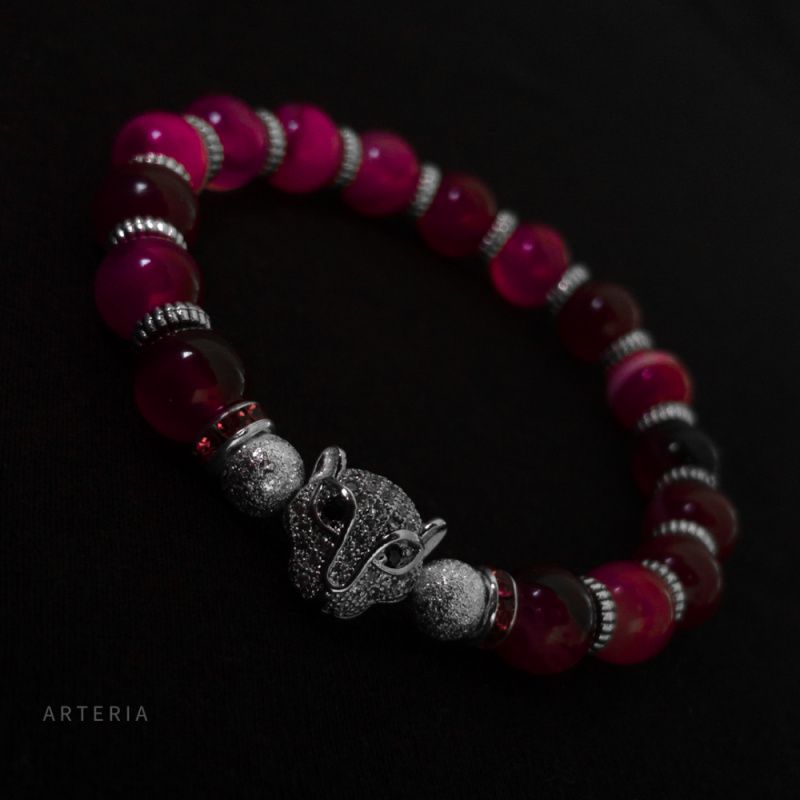 Браслет з малинового агату (розмір намистини 8 мм) зі вставками з металу сріблястого кольору, каменю рожевого кольору і підвіскою «Пантера» (родій, чорний фианит)