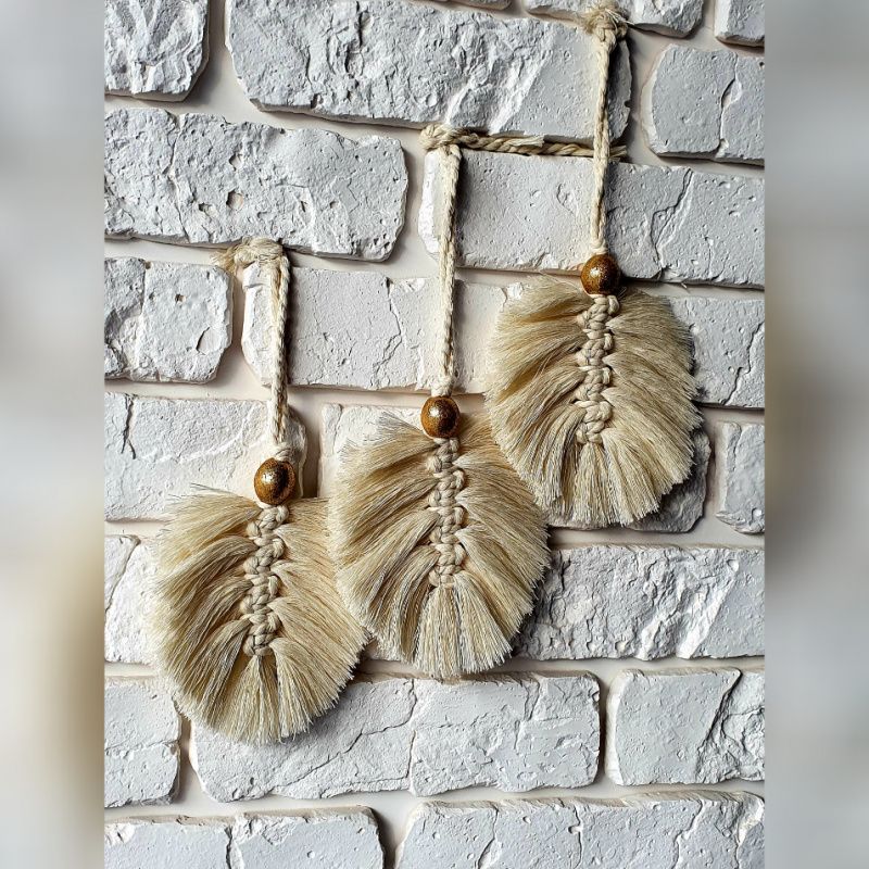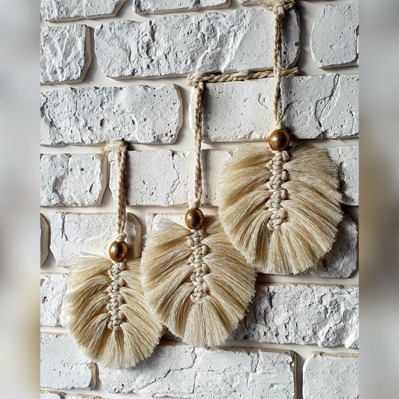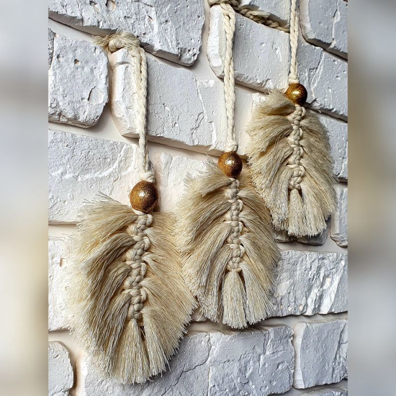 Новорічні пухнасти макраме на ялинку в теплій красивому кольорі айворі з золотими намистинами Набір з 3 шт