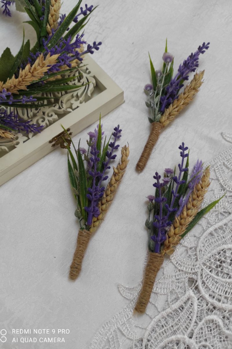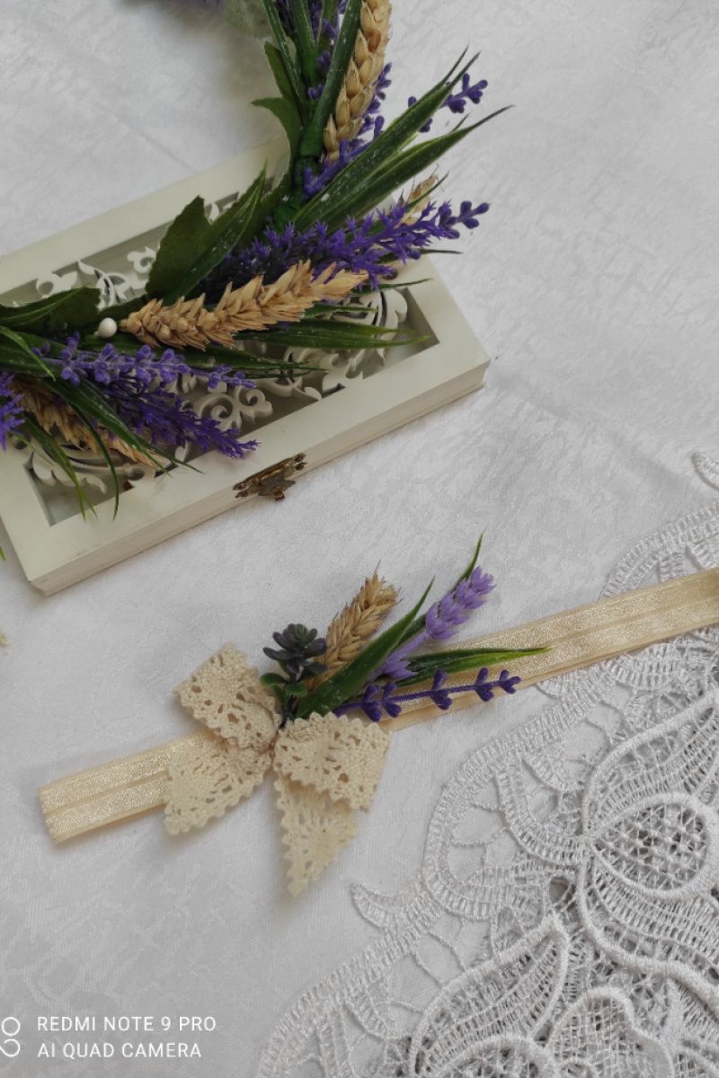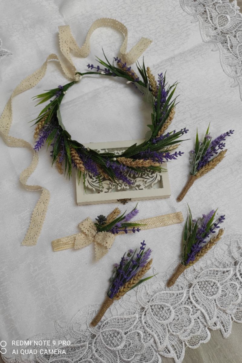 У набір входить: віночок на головудля нареченої, бутоньєрки , пов"язочка для маленької дівчинки. Можливе виготовлення аксесуарів окремо .
