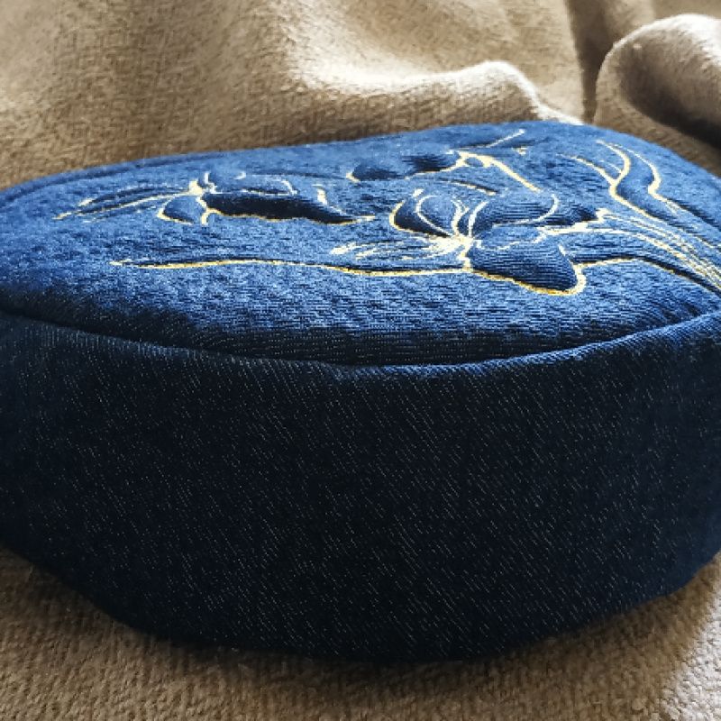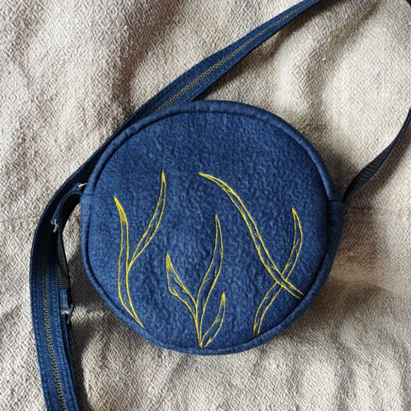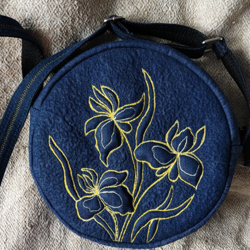 Джинсова сумка з об'ємною вишивкою у техніці трапунто. Завдяки стібці добре тримає форму. Розмір 25*9 см. Ручка регулюється за довжиною. Усередині є кишеня на блискавці та відкрита.