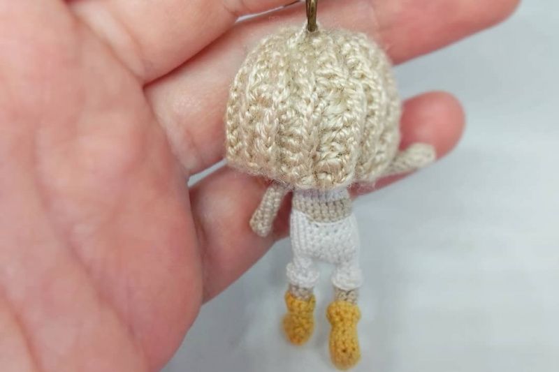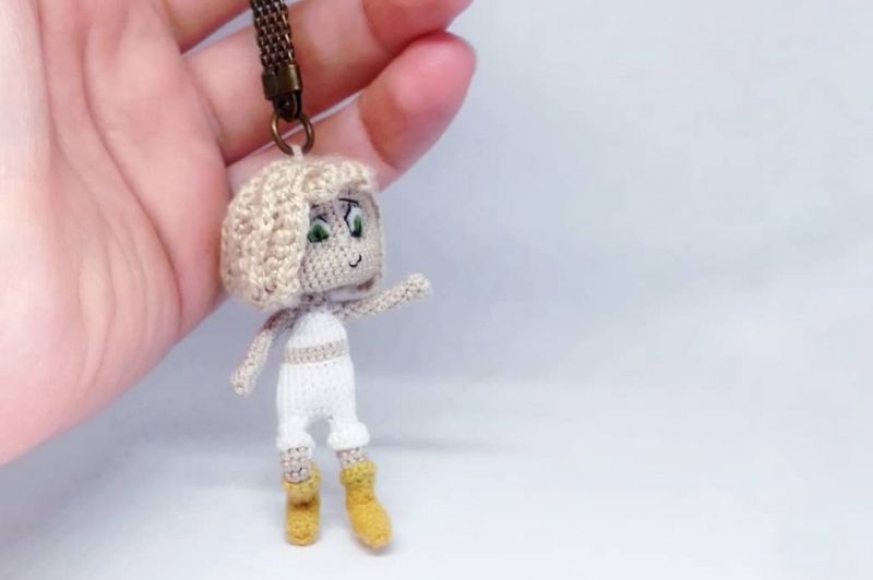 Усередині дротяний каркас (ніжки і ручки можуть змінювати положення). На голові кріпиться кільце-брелок. Прикрасить сумочку, рюкзак, ключі.