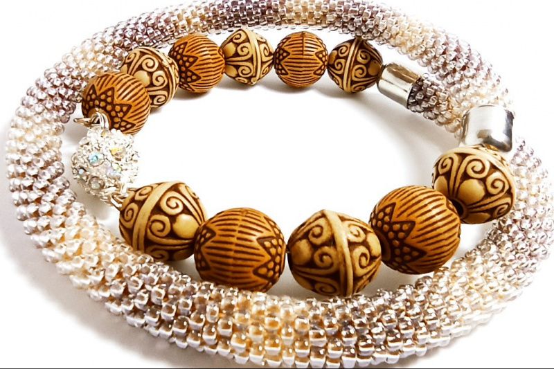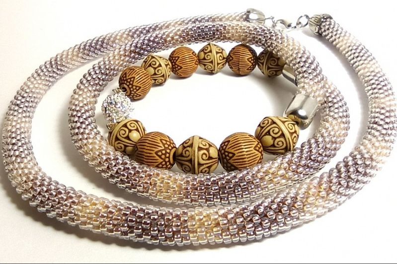 Браслет в два обороти, в'язаний з високоякісного чешського бісеру ( з часом не потьмяніє) , дуже блискучого. В середені браслета меморі проволока, яка надає йому округлої форми, застібка магнітна з хрустальними стразами. Джгут короткий майже чокер, у довжину 40 см. Несе в собі часточку душевного тепла та гарний настрій)