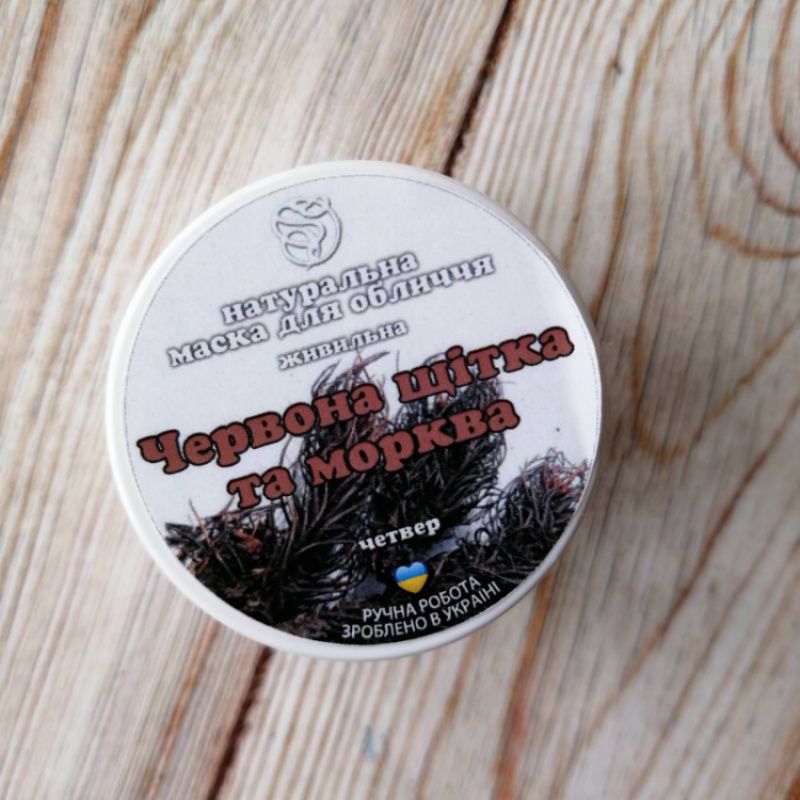 Маска на основі натуральних рослинних олій та інших складників рослинного походження. Містить пудру червоної щітки, гідролат та ефірну олію моркви. Відмінно зволожує, живить, посилює захисні функції, при регулярному застосуванні сповільнює природній процес старіння шкіри. Можна застосовувати для шкіри всіх типів, особливо рекомендовано для сухої, зрілої, тьмяної шкіри. Перед першим використанням обов’язково зробіть алергічну пробу на згині ліктя (!)