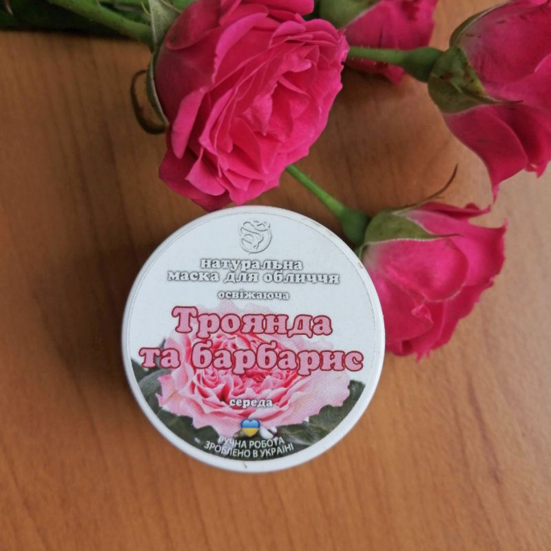 Маска на основі натуральних рослинних олій та інших складників натурального походження. Містить білу глину (каолін) та порошок дамаської троянди, має комплексний освіжаючий та омолоджуючий ефект, зволожує та підтягує, вирівнює тон шкіри та покращує колір обличчя. Рекомендовано для всіх типів шкіри. Перед першим використанням обов’язково зробіть алергічну пробу на згині ліктя (!)