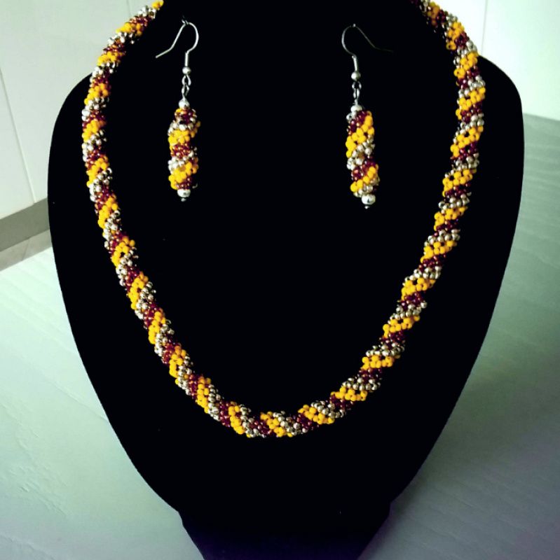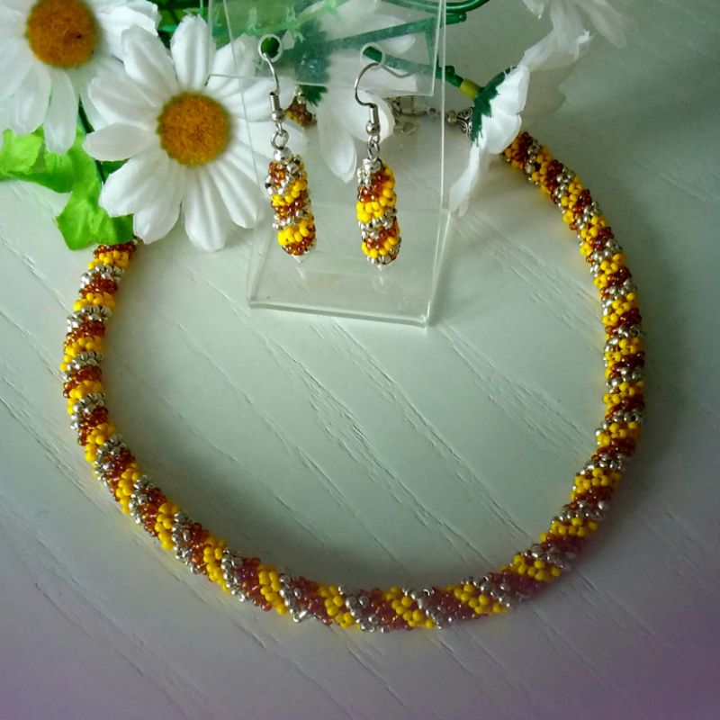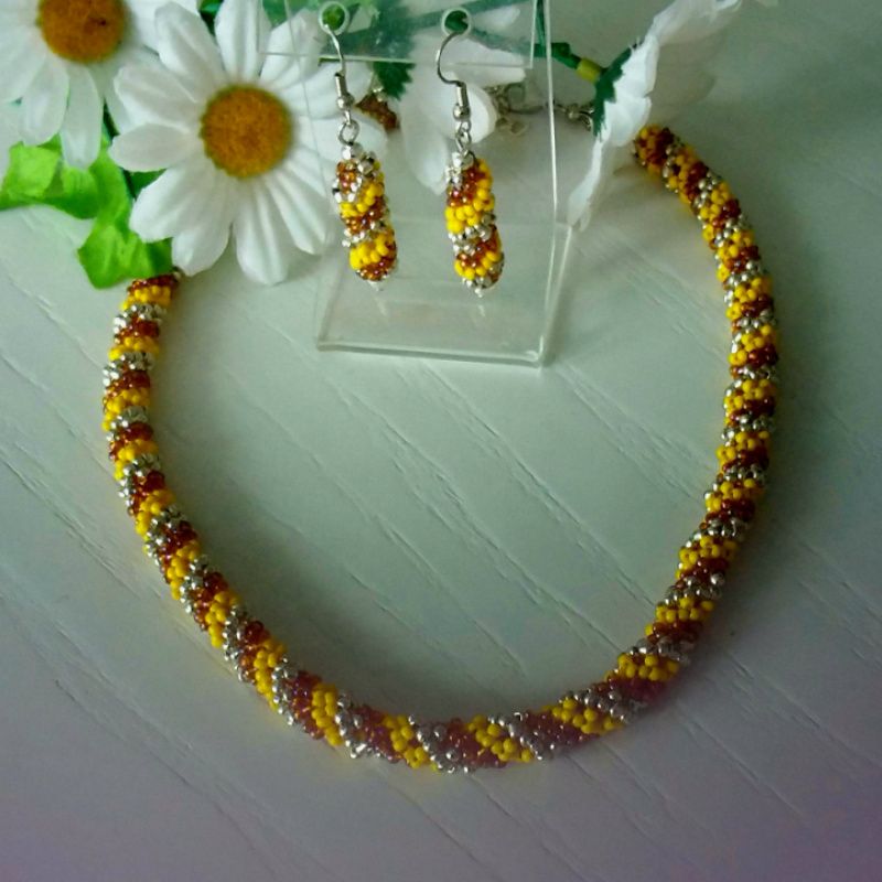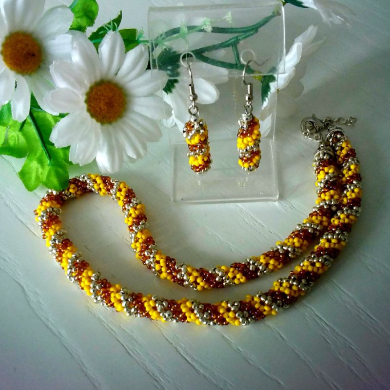 Легкий, приємний на дотик джгут виготовлений з жовтого, світло-коричневого та срібного чеського бісеру. Джгут виготовлений за допомогою голки та капронової нитки. Тому джут легкий, еластичний, ніжно прикрашає, не обтяжує в літній період. Довжина кольє від 45 см, є ланцюжок-подовження. Додатково замовляйте сережки, ідентичні джгуту. не пожалкуєте, так стверджують замовники.