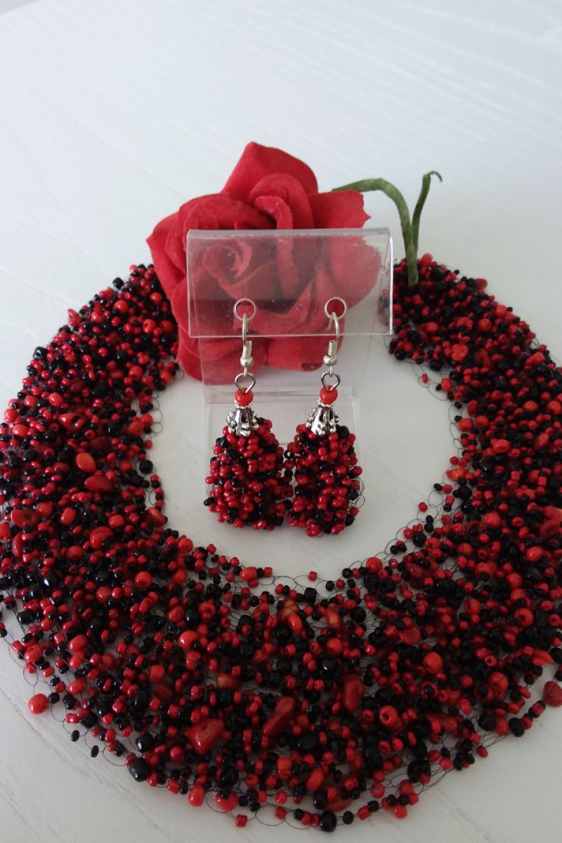 Яскраве повітряне кольє виготовлено з червоного, чорного бісеру різного розміру та червоних коралів. Кольє приваблює погляди, додає Вам сміливості та впевненості. Довжина кольє від 46 см, є ланцюжок-подовження. Додатково можливо замовити сережки, браслет ідентичні кольє. Замовляйте та носіть з задоволенням!