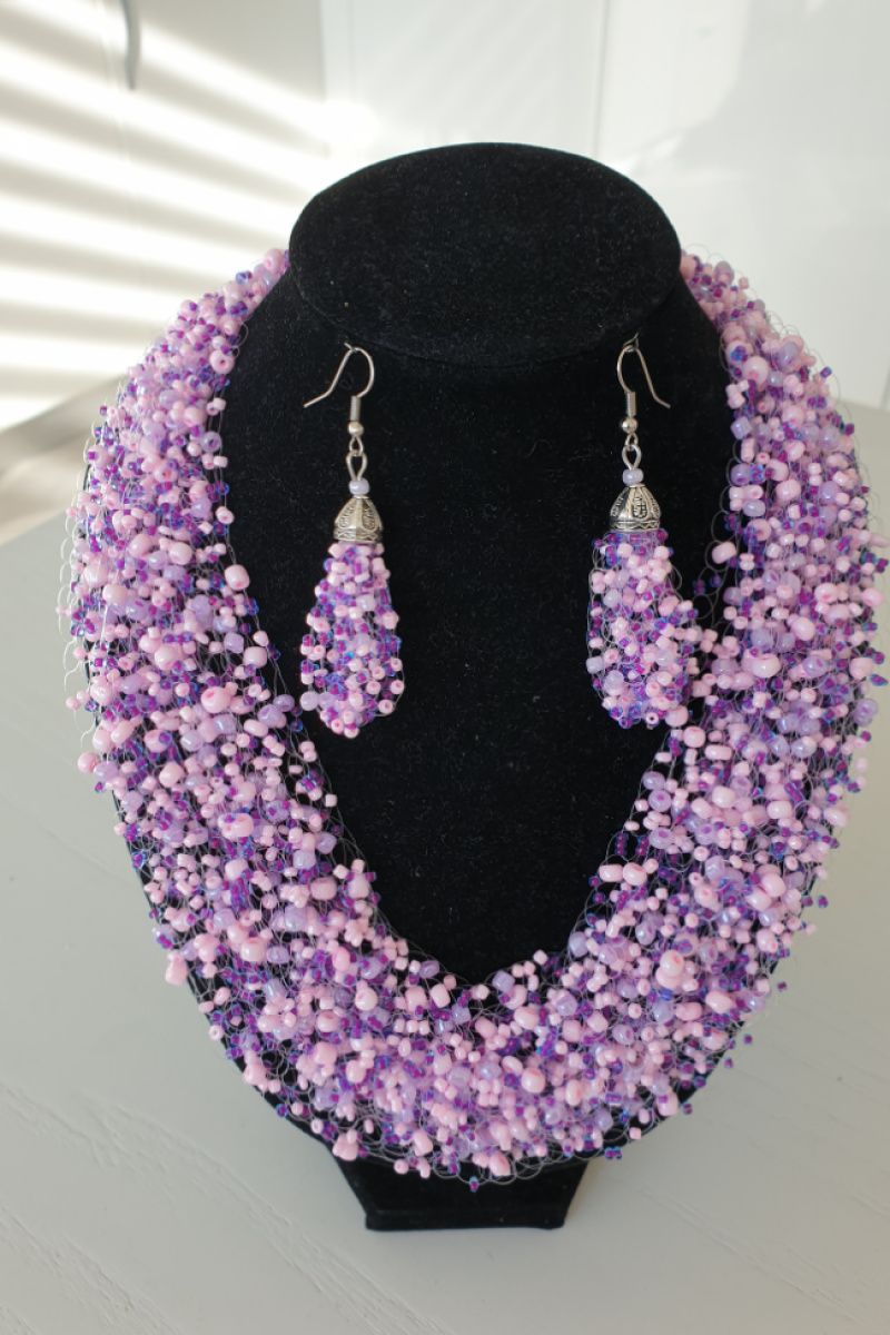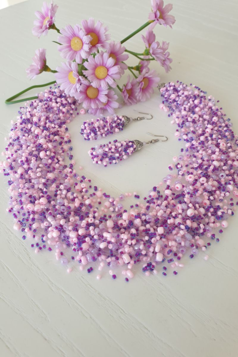 Ніжне, і в той же час привабливе, повітряне кольє виготовлено з ніжного світлорожевого та мерехтливого фіолетового бісеру різного розміру. Поєднання цих гарних кольорів бісеру дозволило кольє приваблювати погляди, та відчувати себе в такій прикрасі впевненішою. Довжина кольє 46 см, є ланцюжок-подовження. Додатково можна замовити ідентичні кольє сережки. Замовляйте та носіть з задоволенням!