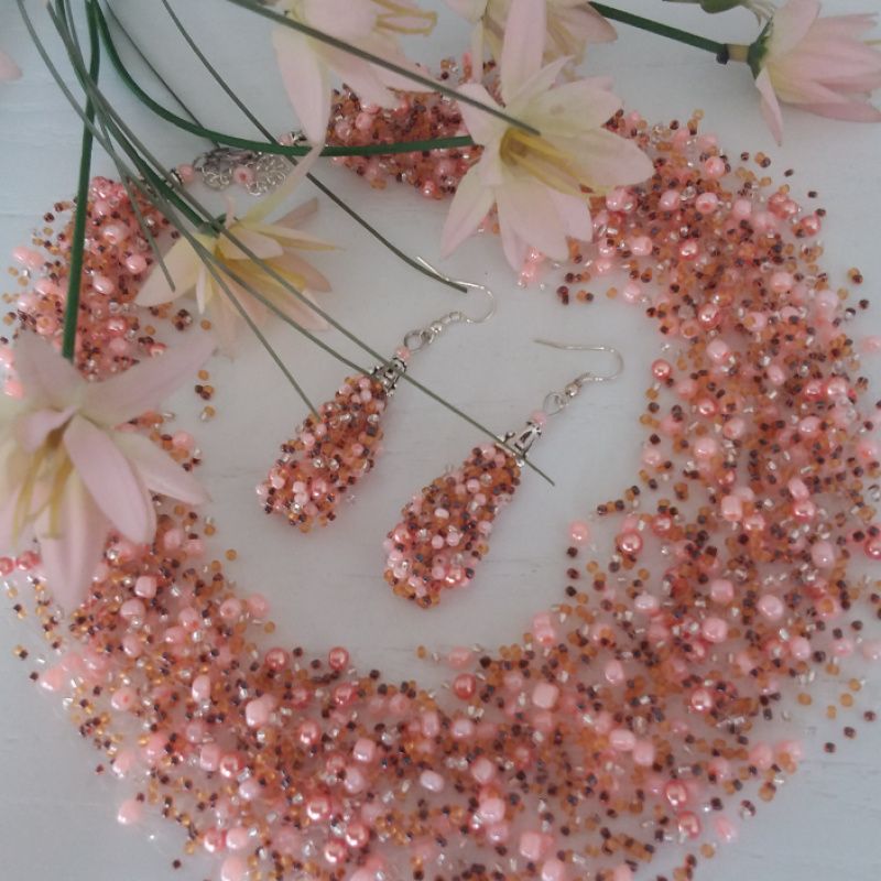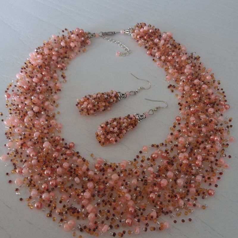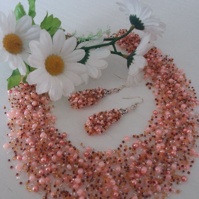 Повітряне кольє виготовлено с персикового, дзеркального, коричневатого бісеру різного розміру та жемчужних намистин персикового кольору. Кольє приваблює погляди, додає Вам ніжної чарівності. Довжина кольє 46 см, є ланцюжок-подовження. Додатково замовляйте сережки, браслет ідентичні кольє. Замовляйте та носіть з задоволенням!