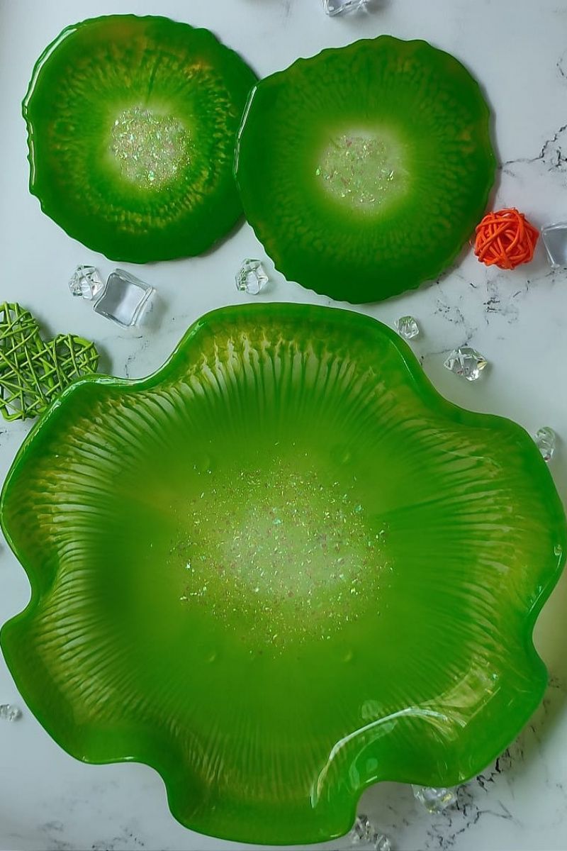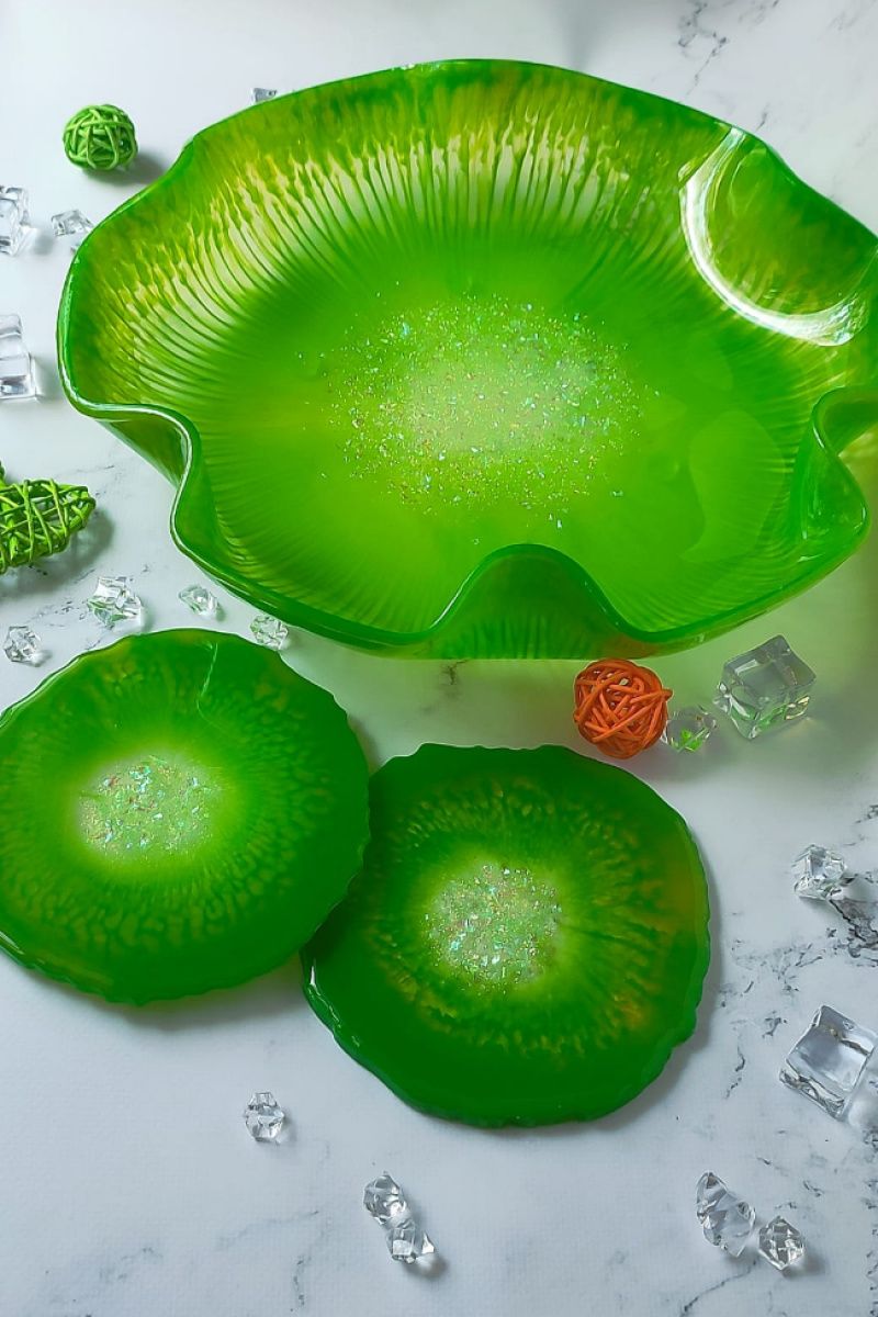 Фруктовниця розмір 31 см і набір підставок 13 см з епоксидної смоли. Можна використовувати під келихи, кухлі, прикраси. Фруктовница на силіконових ніжках.