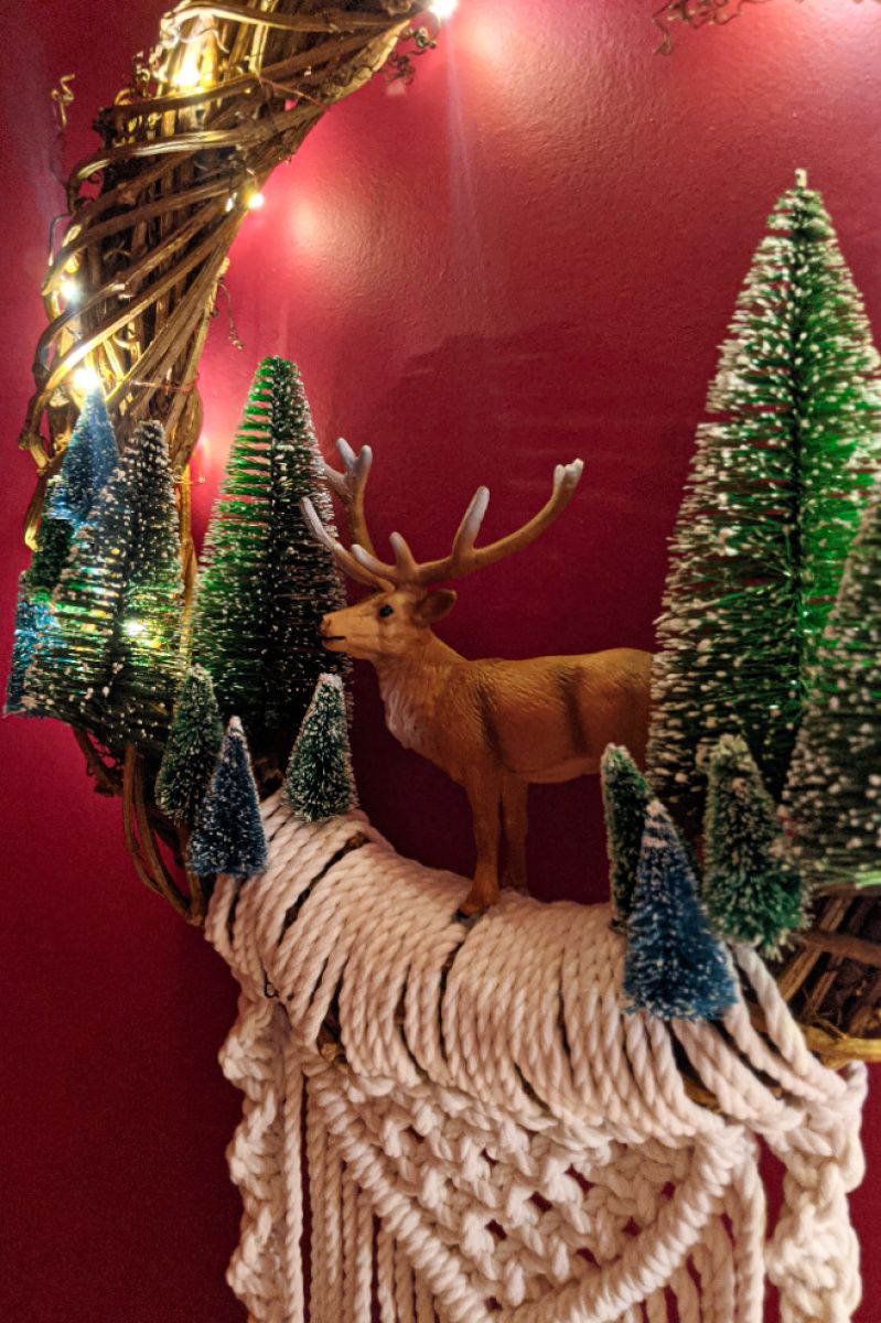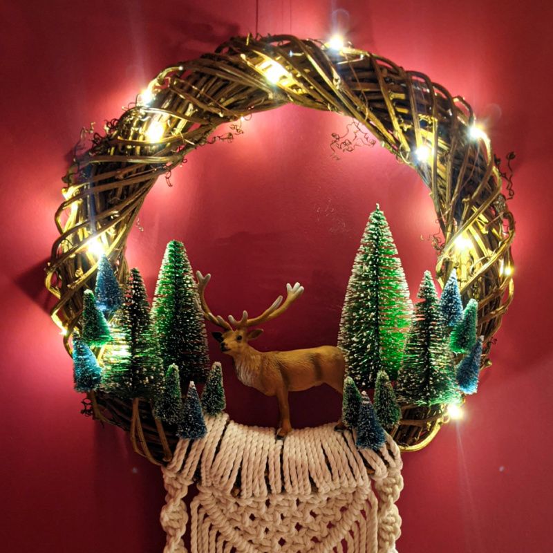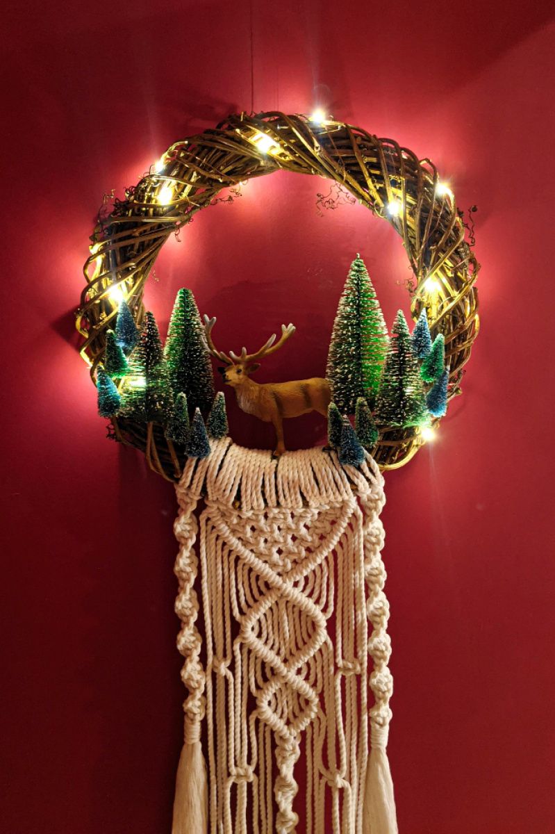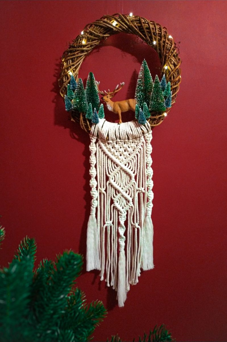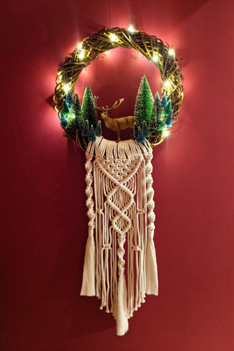 Різдвяні вінки ручної роботи з виноградної лози і плетіння з макраме. Прикрашений маленькими ялинками, оленями та світлодіодними герлендами. Різдвяні ліхтарики працюють від двох батарей CR2032. Зроблено вручну та з великою любов'ю!