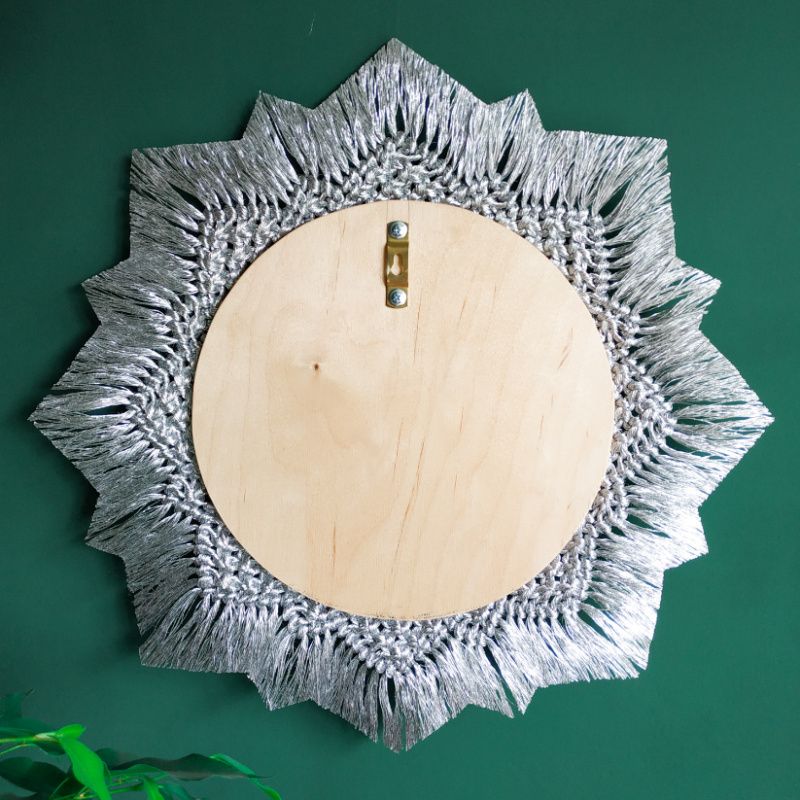 Ця прекрасна макраме у формі сонця виготовлена ​​з 60% бавовни та 40% люрексу, дзеркальної мозаїки та дерева. Форма сонця виткана вручну. Промені макраме на сонці покриті спеціальним лаком для підтримки ідеальної форми, саме переплетення може згинатися, тому його завжди можна вирівняти.
