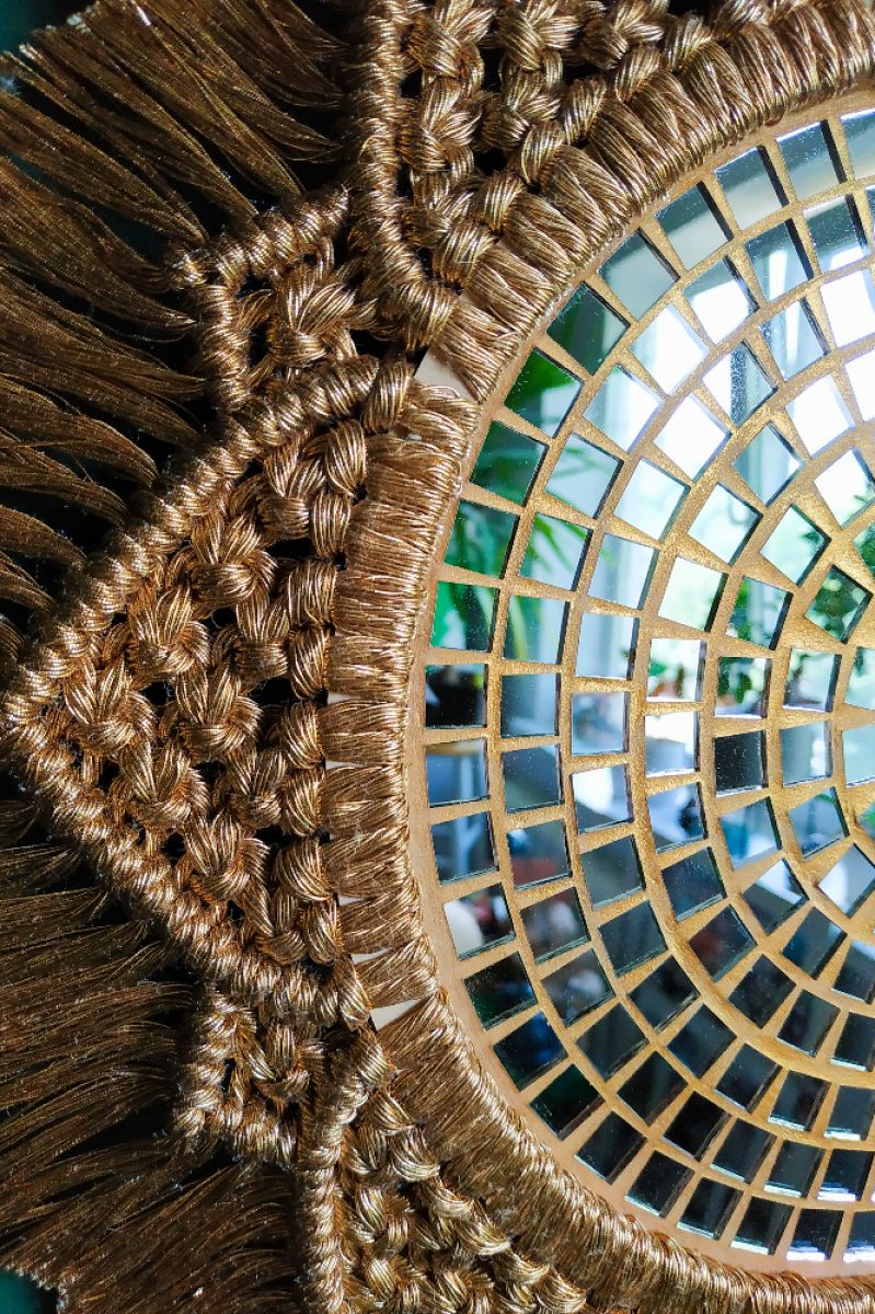Ця прекрасна макраме у формі сонця виготовлена з 60% бавовни та 40% люрексу, дзеркальної мозаїки та дерева. Форма сонця виткана вручну. Промені макраме на сонці покриті спеціальним лаком для підтримки ідеальної форми, саме переплетення може згинатися, тому його завжди можна вирівняти.