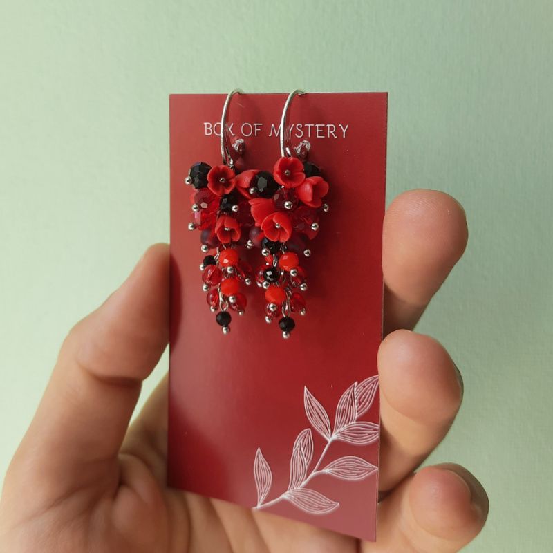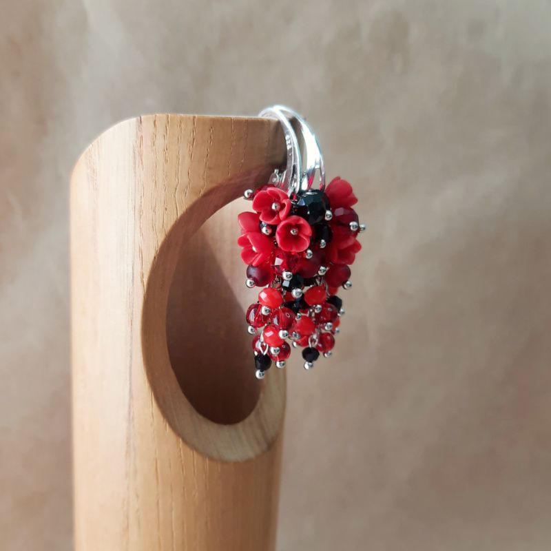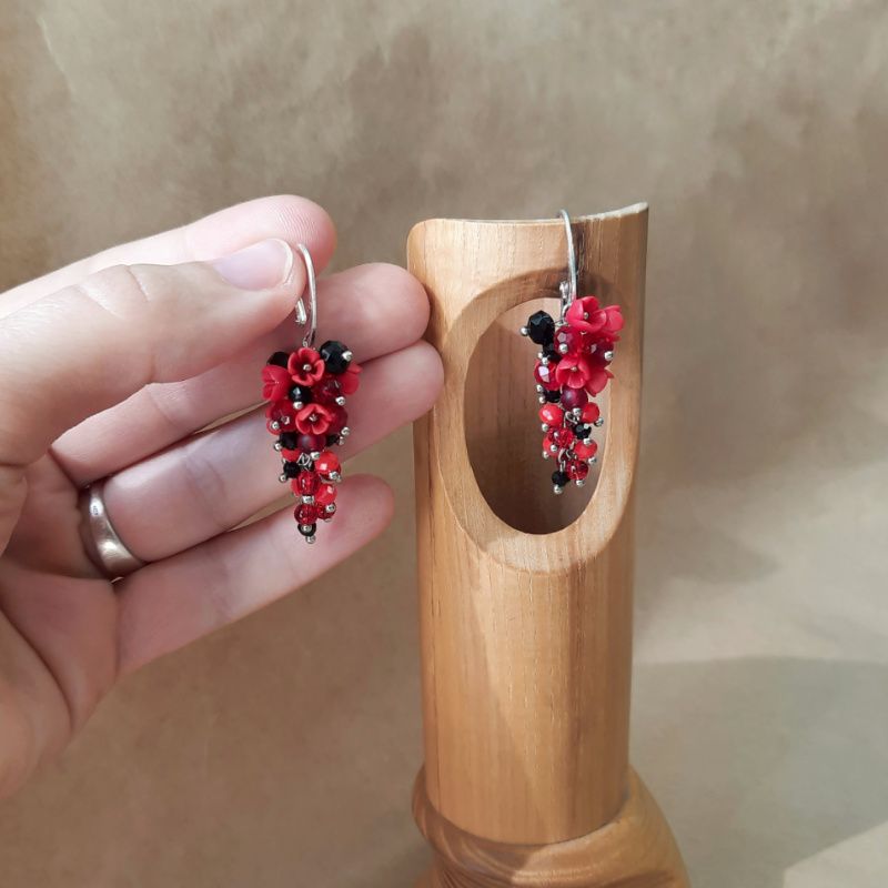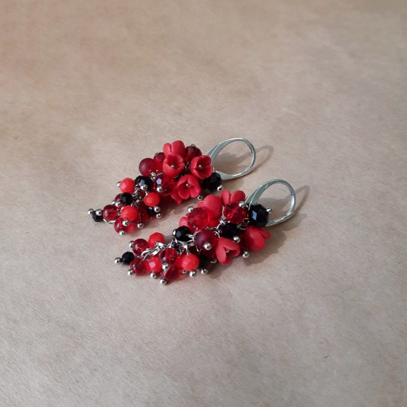 Прикраса з мініатюрними квітами ручної роботи з полімерної глини з кришталевими і скляними намистинками. Кожна квітка виліплений окремо без використання молд. Використана якісна металлофурнитура. Швензи срібні 925 проби. Довжина грона 3 см