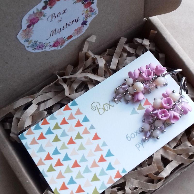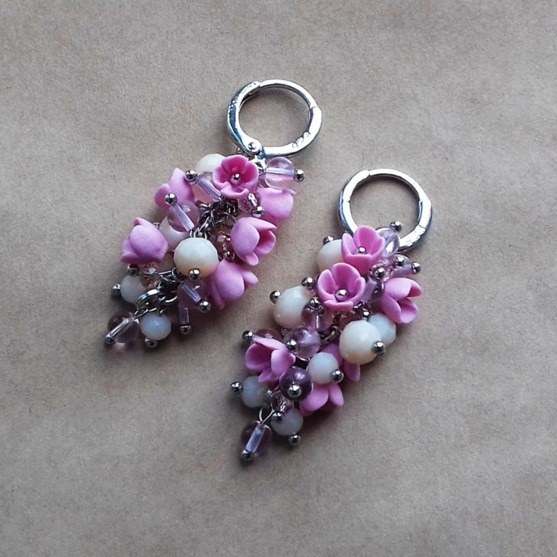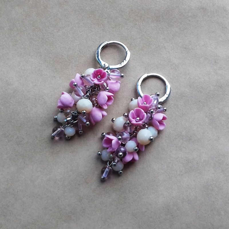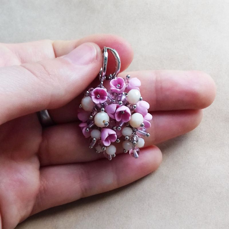 Прикраса з мініатюрними квітами ручної роботи з полімерної глини з кришталевими і скляними намистинками. Кожна квітка виліплений окремо без використання молд. Використана якісна металлофурнитура. Швензи срібні 925 проби. Довжина грона 3 см