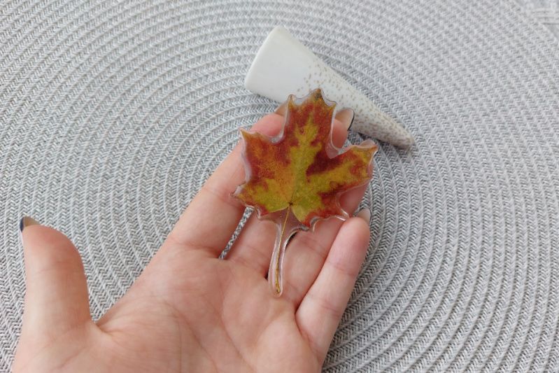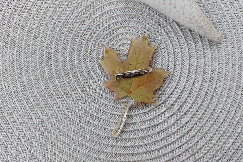 Брошка ручної роботи Листя Клена виконана з справжнього листочка, а також ювелірної епоксидної смоли. Виконання роботи – бездоганне! На дотик нагадує скло (щоб краще розуміти, що це за виріб). У брошки гостра міцна основа виробництва Японія. Розмір: * Довжина з хвостиком - 8,6 см; * Ширина - 6 см (в найширшому місці). Товар продається у гарній упаковці.