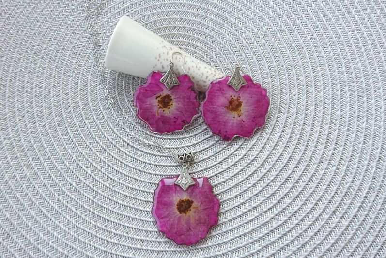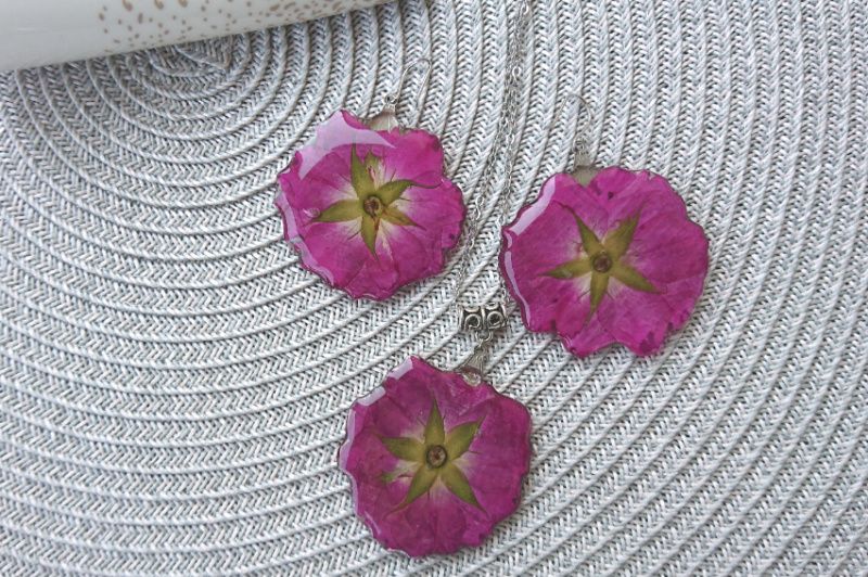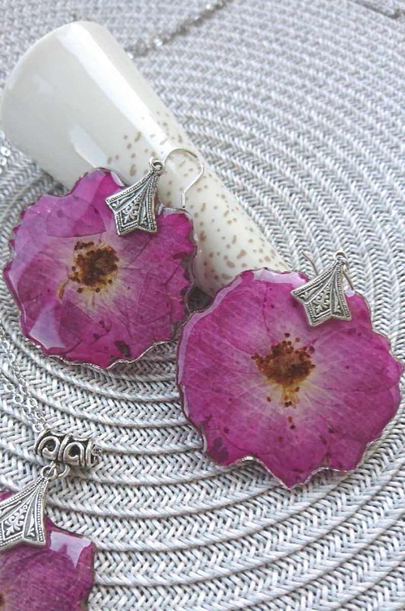 виконаний зі справжніх садових трояндок гарного відтінку, а також ювелірної смоли! Комплект прикрашений найшикарнішою фурнітурою у світі хендмейду: посріблена латунь, виробництво США. Швензи у сережках – латунь, вкрита білим золотом (виробництва Південної Кореї). До кулона додається ланцюжок потрібної довжини, а також гарний утримувач. Набір прикрас Роза продається в подарунковій упаковці.