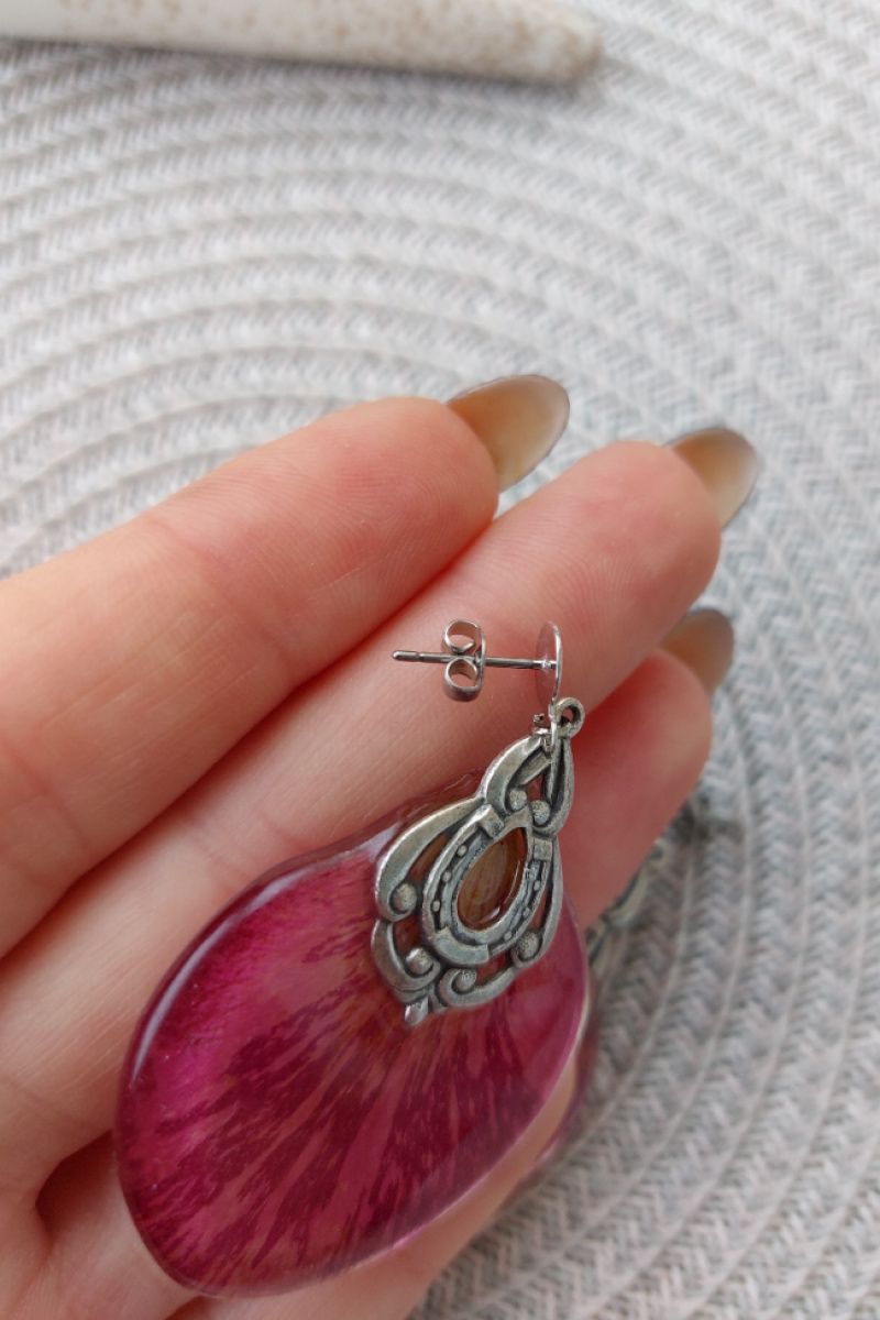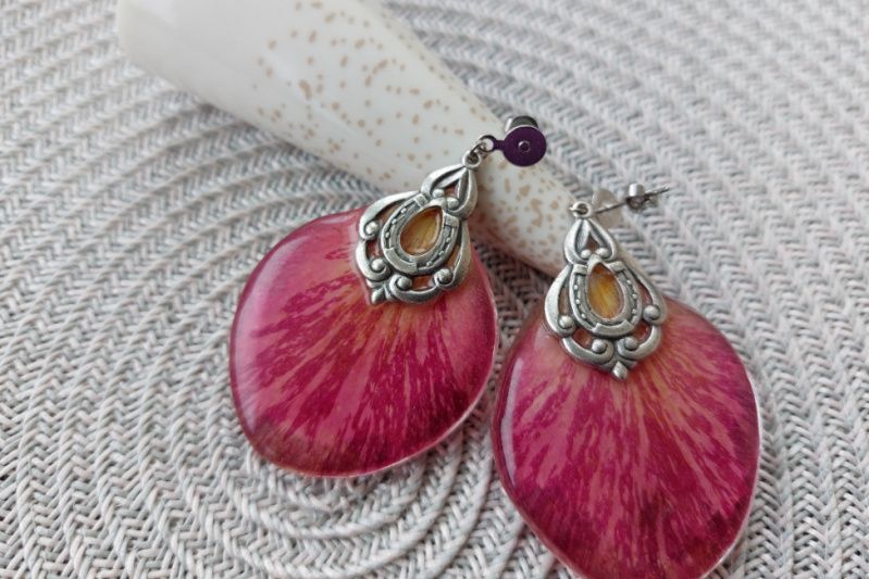 Сережки ручної роботи Пелюстки Троянд виконані з пелюсток справжніх садових троянд незрівнянно красивого кольору, а також ювелірної епоксидної смоли. Виконання роботи – бездоганне! На дотик нагадують сережки скло (щоб краще розуміти, що це за виріб). Фурнітура – божественно красива, виробництво США, матеріал – посріблена латунь (дуже якісна, не облазить, не викликає алергію). Швензи у сережках - гвоздики, дуже зручні! Матеріал – родована латунь. Виробництво Південної Кореї. Сережки дуже легкі, на вушках практично не помітні. Висота з урахуванням декоративного елемента (+-) 5 см; ширина - 3,5 см. Товар продається у гарній упаковці.