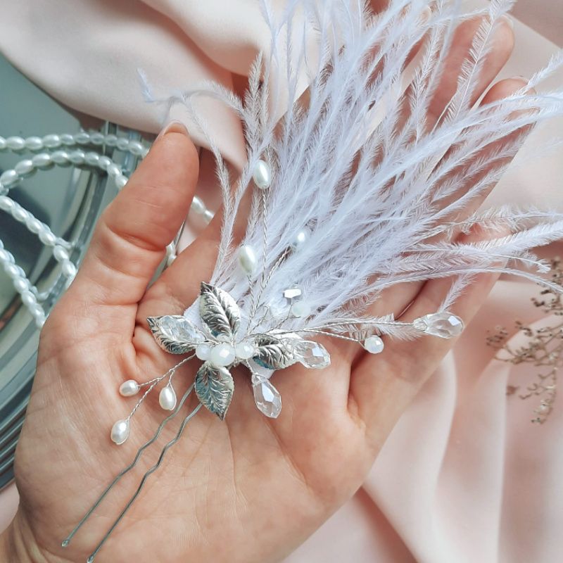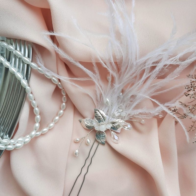 Основа ювелірний дріт, пір'я страуса, справжні перлини, кришталеві намистини, металеве листя.