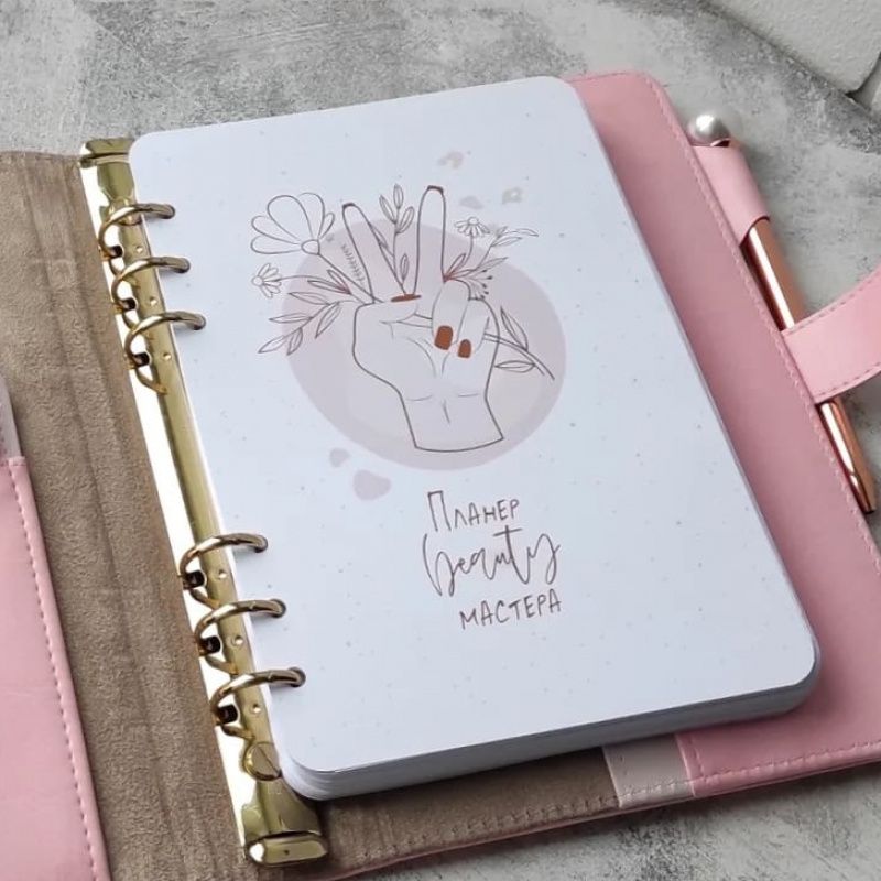 Планер для beauty майстра на кільцевому механізмі, ручної роботи виконаний з нуля. Обкладинка обтягнута італійською екошкірою. Формат А5. Блок складається з таких розділів: