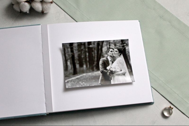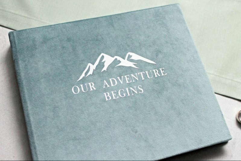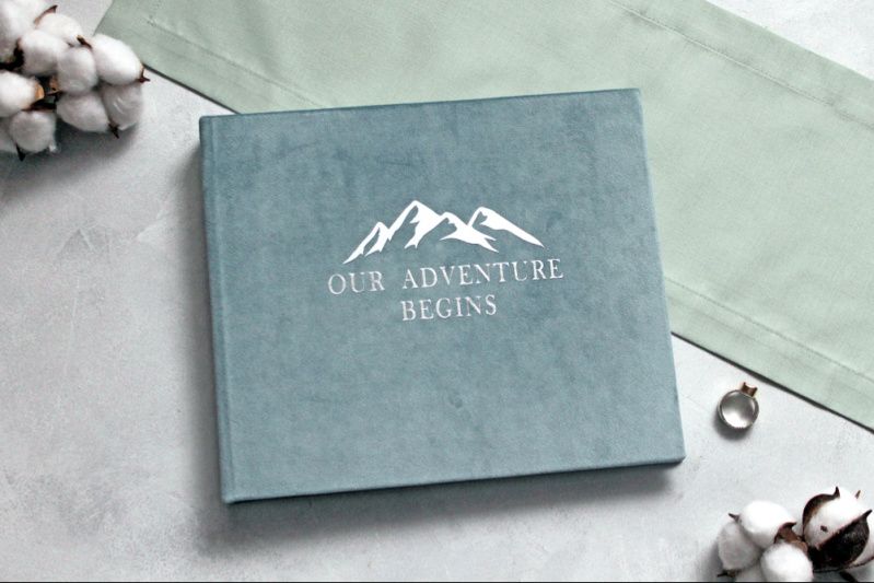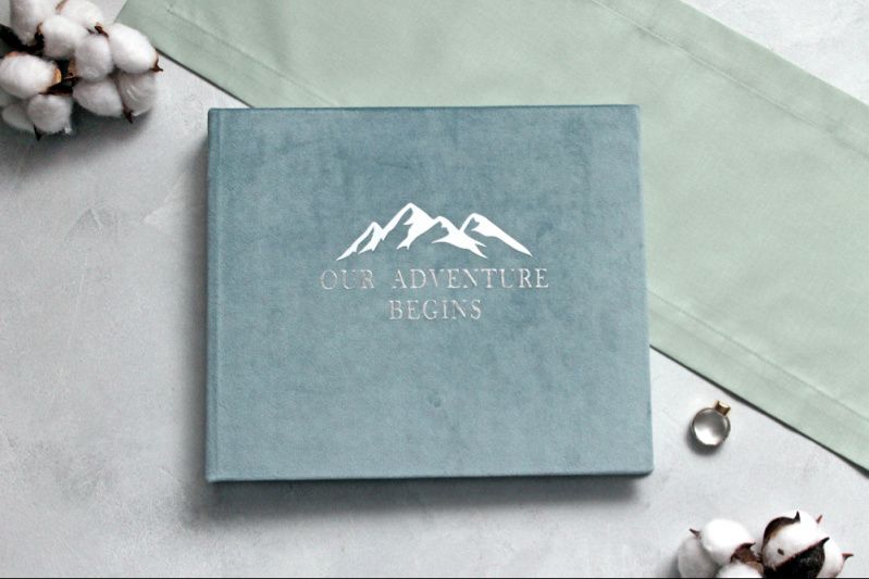 Ніжний альбом для фотографій кольору вінтажної м'яти. Головний декор - білі гори, а напис зроблено срібним кольором. Такий альбом стане чудовим подарунком з нагоди заручин чи річниця одруження, або подарунком для близьких.
