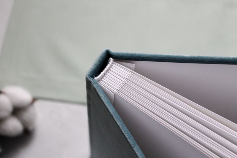 Альбом виготовленео з дизайнерського картону та оксамитової тканини. Аркуші зшиті та зклеєні між собою.