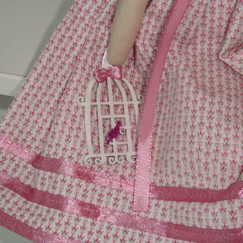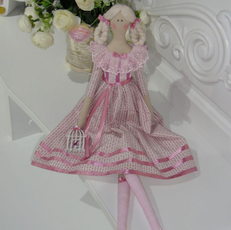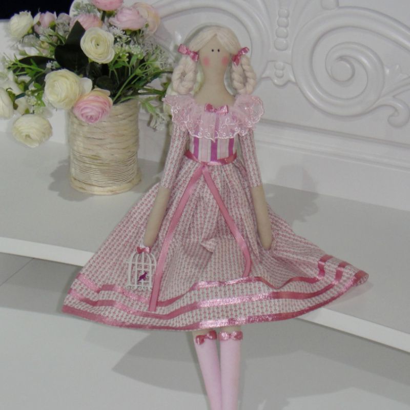 Лялька Тільда виготовлена з натуральних матеріалів: тіло та сукня 100% бавовна, декорована атласною стрічкою та мереживом, волосся пряжа, наповнювач холлофайбер, в руках ляльки клітка з пташкою.