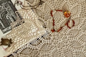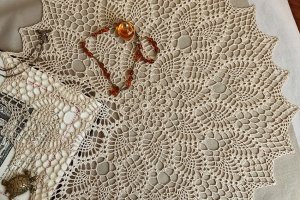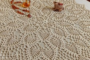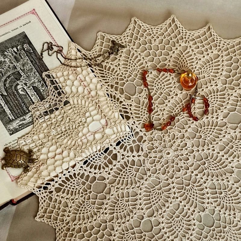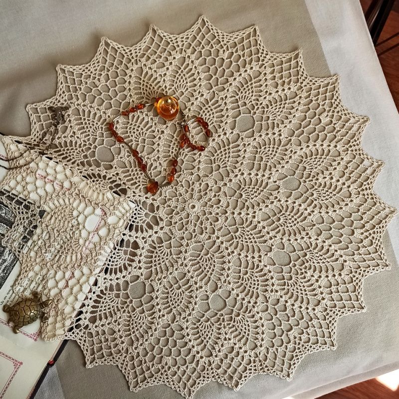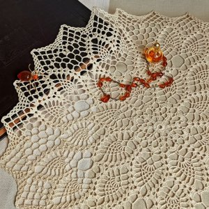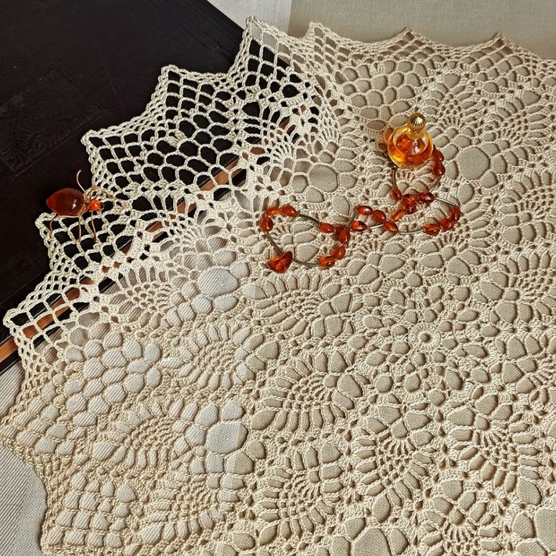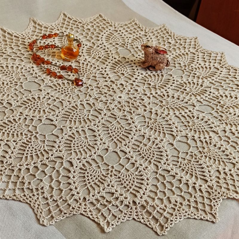 Класична плетена гачком серветка з ананасовим візерунком. Прикрасить круглий стіл, комод для білизни, поличку над каміном тощо. Нейтральний світло-бежевий відтінок. Чудове доповнення для інтер'єрів у стилі прованс.