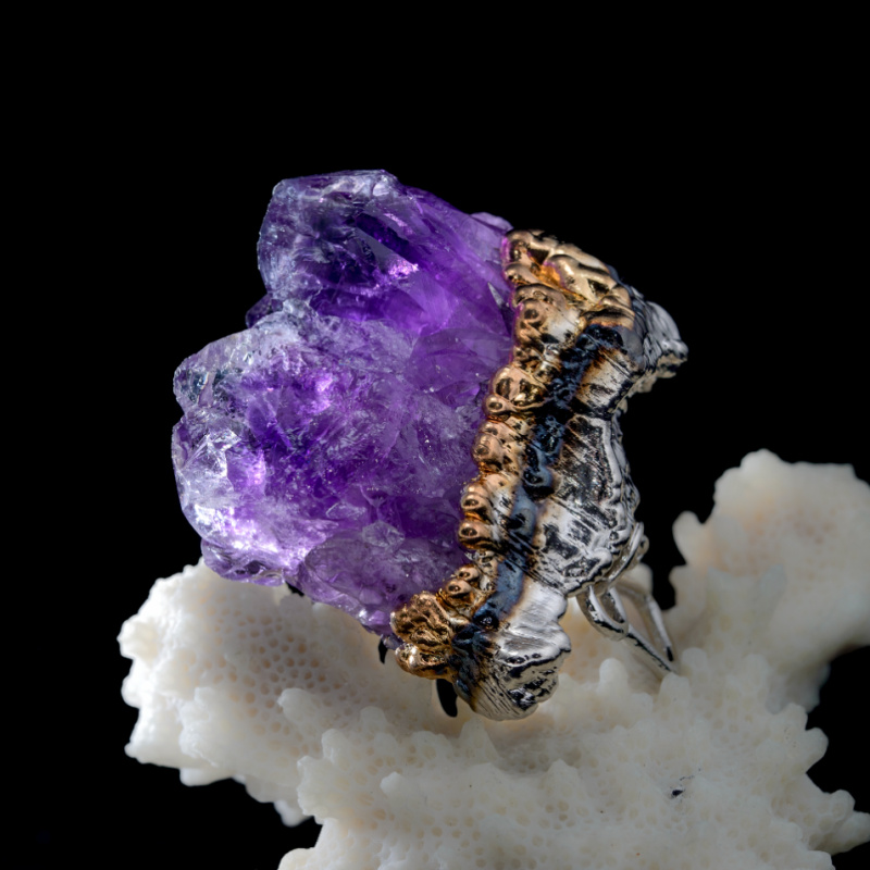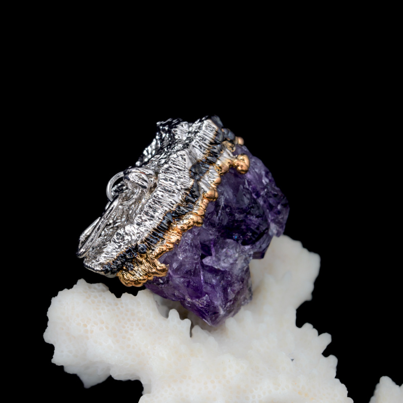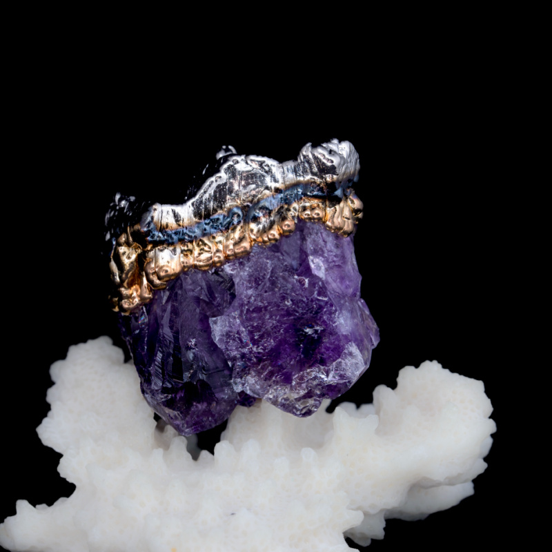 Природній зросток кристаллів світлого аметисту на підложці (друза) покритий міддю, нікелем і дорогоцінним металом - білим родієм.