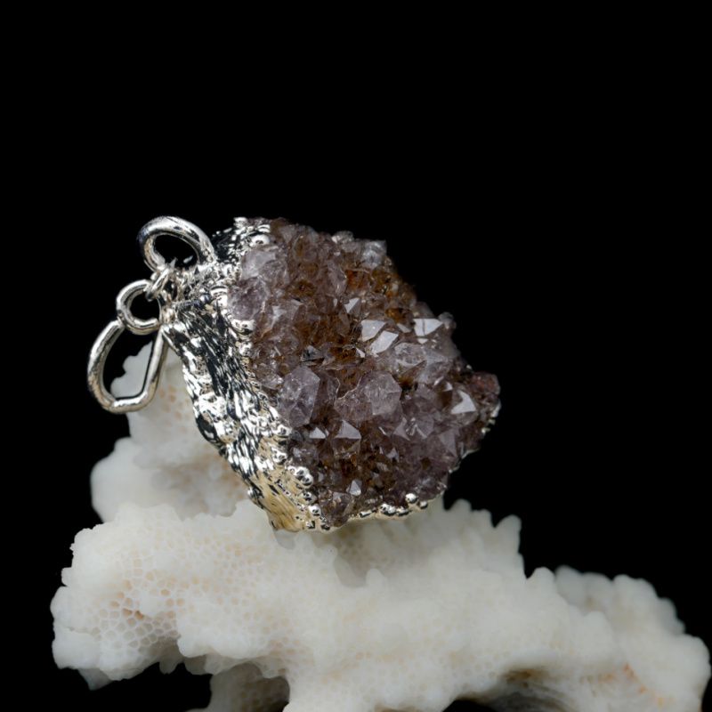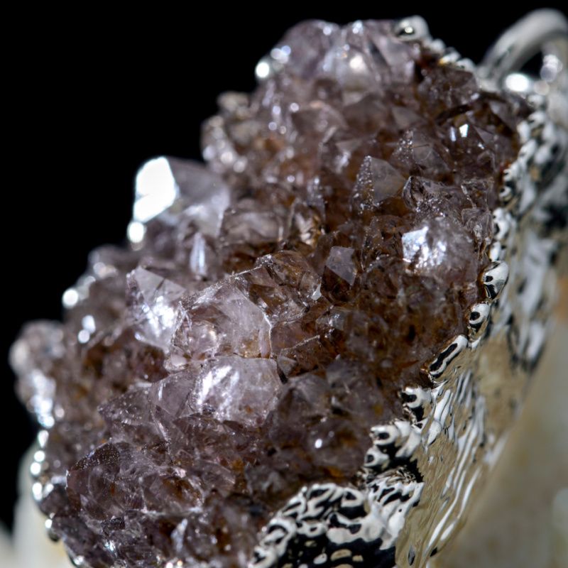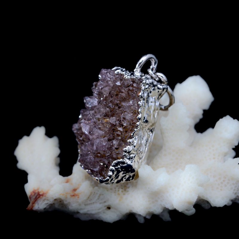Друза аметисту покрита міддю, нікелем і металом платинової групи - білим родием. Природний зросток кристалів має природні включення, тріщини і шорсткості. Каучуковий шнурок будь-якої довжини або ланцюжок в подарунок.