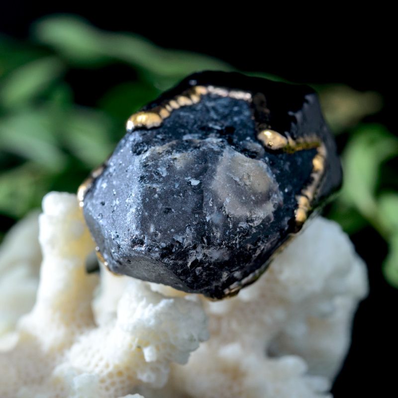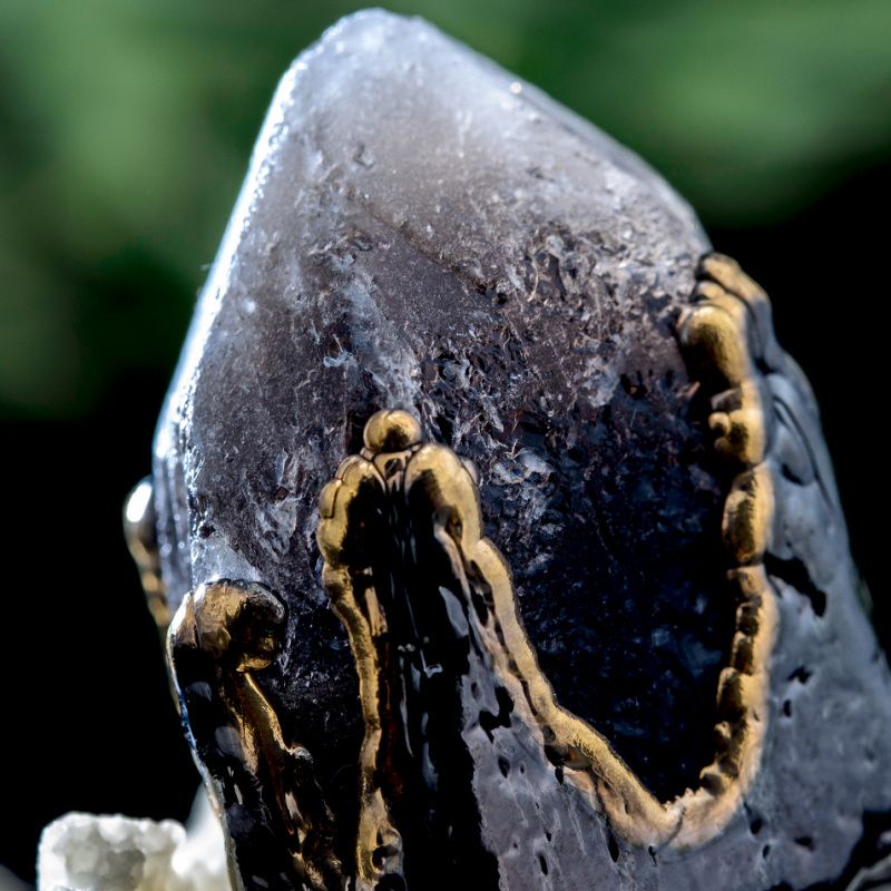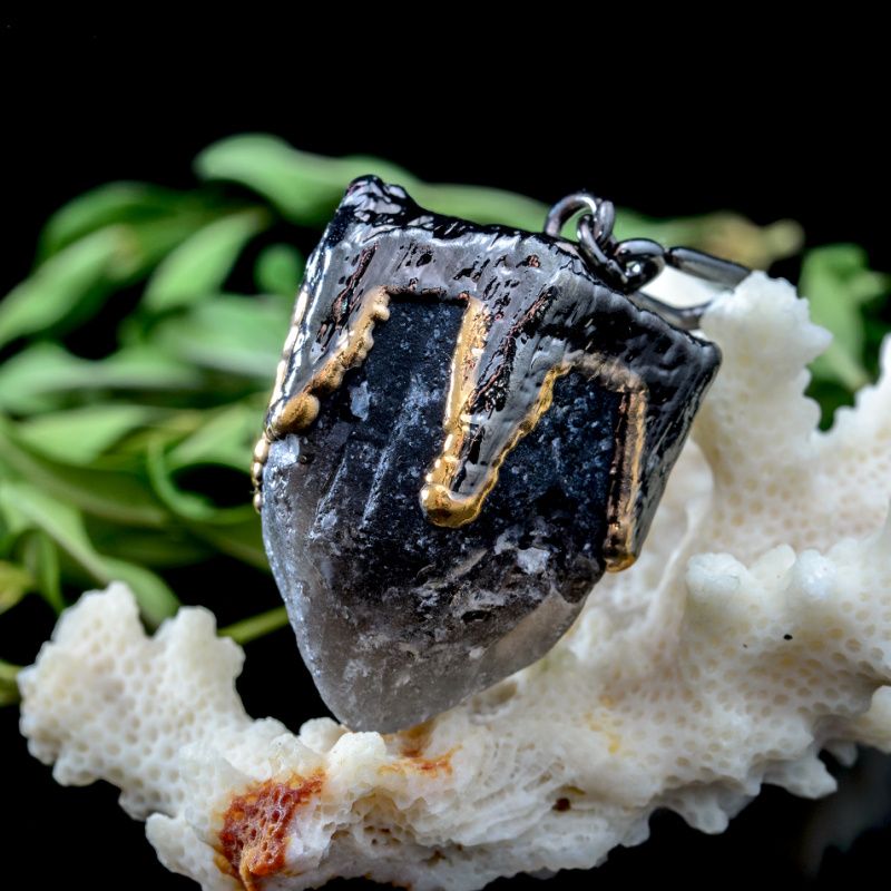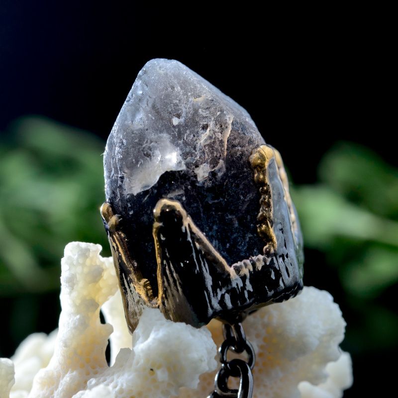 Природний необроблений кристал покритий міддю, нікелем та металом платинової групи – рутенією. Локальне нанесення золота 24 карати. Камінь поцяткований тріщинами і шорсткістю. Кристал з'єднує кілька видів кварців. Усередині знаходиться темний раухтопаз, навколо нього зростав світліший камінь зі світлим кінчиком. Є місце, де камінь дуже світлий і майже прозорий (гірський кришталь). За рахунок злиття всіх мінералів в одному кулоні вони посилюють здібності один одного. Камінь не гранили, не завдавали йому жодної шкоди, він має добру енергетику.