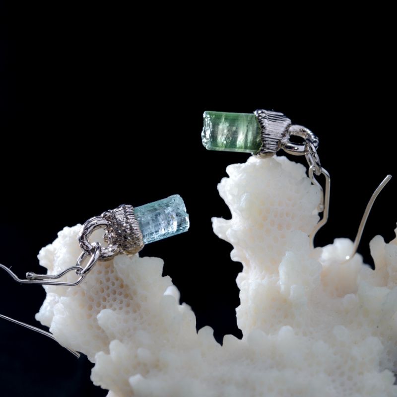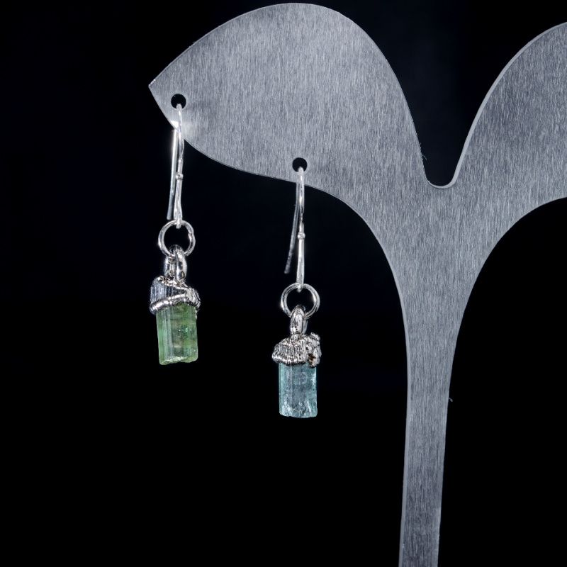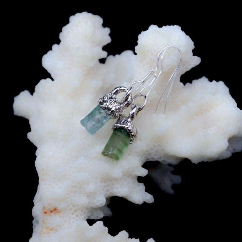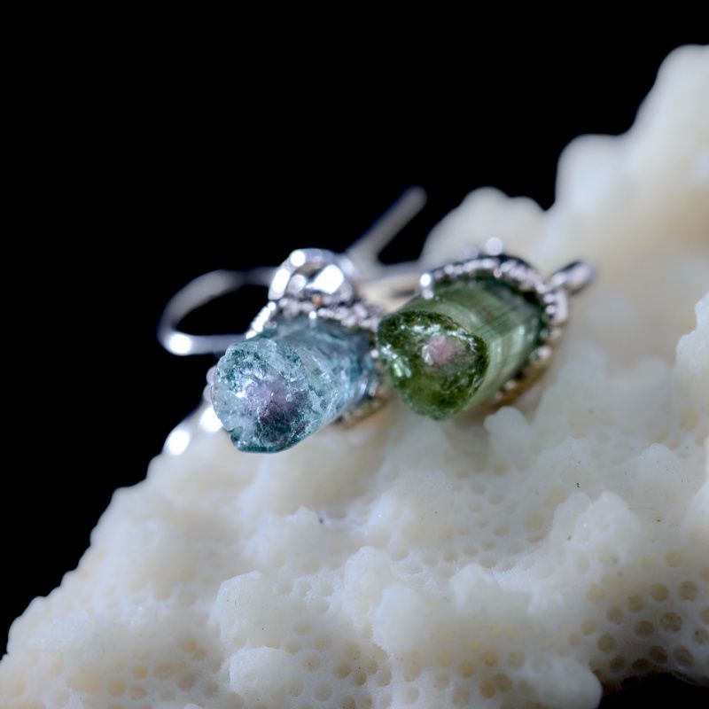 Маленькі природні необроблені кристали турмаліну. Різні. Один із зеленим відтінком, другий – із блакитним. Усередині кристала можна побачити маленьку рожеву серединку. Необроблені кристали мають природні включення, тріщини та шорсткості.