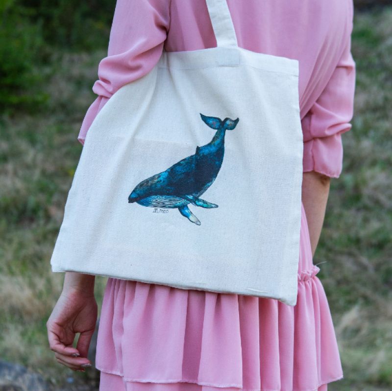 Еко-торбинка з високоякісної небіленої саржі з авторським акварельним малюнком у вигляді принту. Чарівний синій кит заворожує своєю красою та величчю.