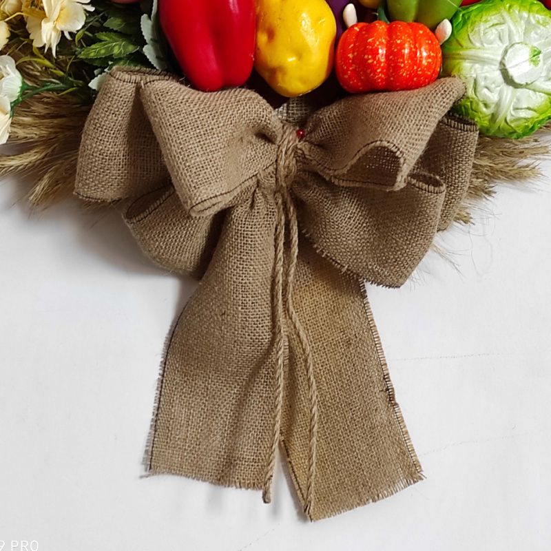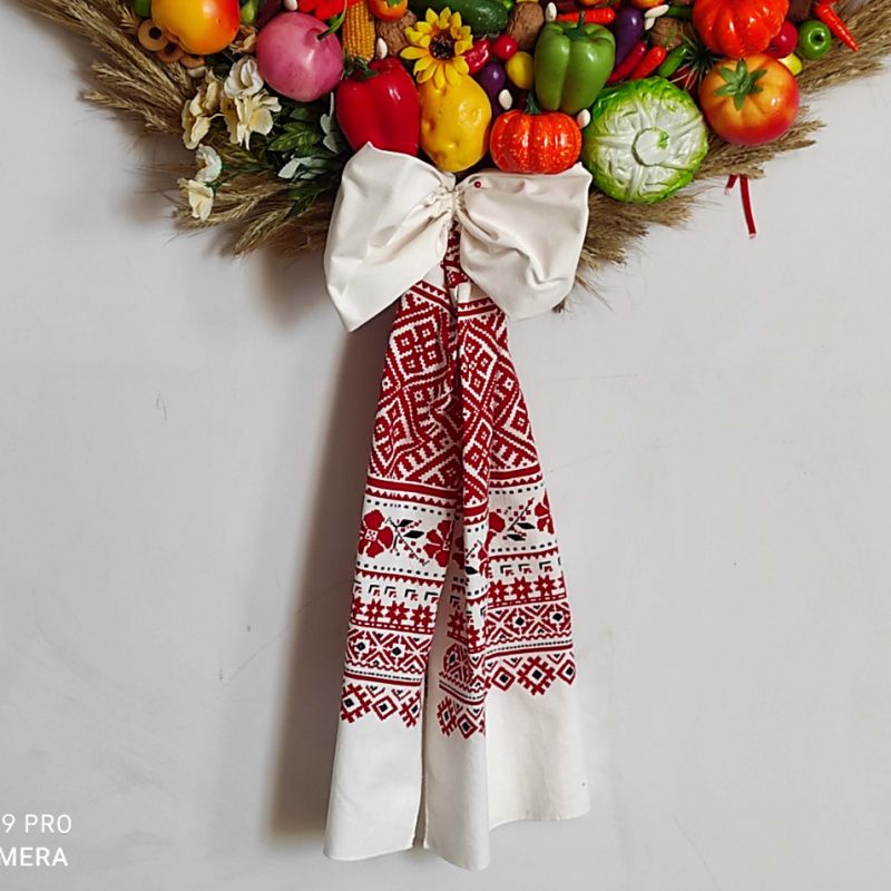 Вінок зроблений з більш ніж 250 штучних фруктів і овочів, штучних квітів, засушених овочів, горіхів, колосків пшениці і банта з мішковини. Можливий варіант вінка без банту або бантом з українського рушника.