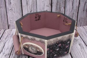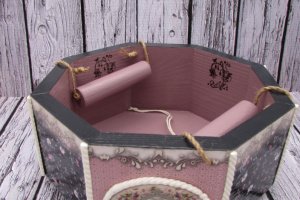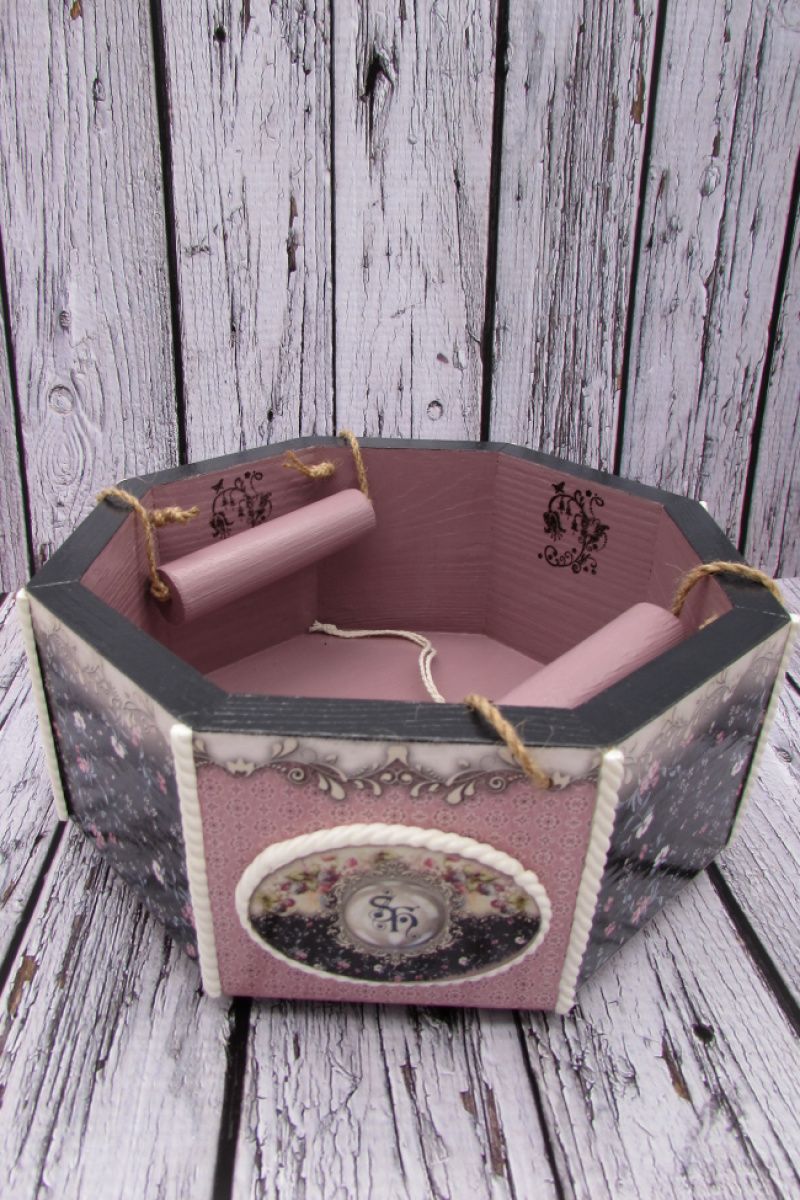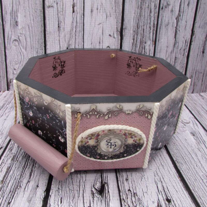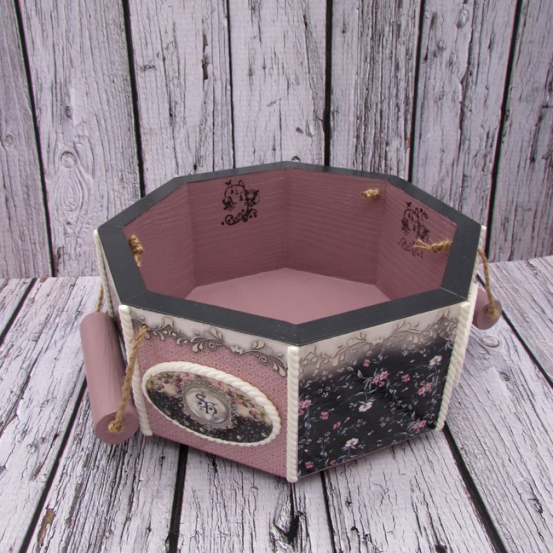 Оригінальна козуб з сосни, з двома дерев'яними ручками, для солодощів, фруктів, горішків. Козуб декоровано в техніці декупаж. Прикрашено козуб шильди і виливками ручної роботи, у вигляді тоненьких канатіков.Все це надає козуб оригінальність і неповторність. Йдучи на свято, наповніть козуб солодощами, і подарунок готовий. При декоруванні використовувалися матеріали на водній основі, не шкідливі для здоров'я оточуючих.