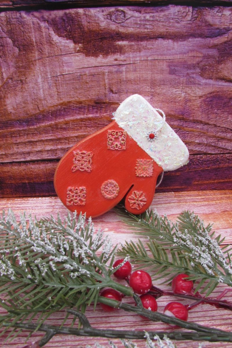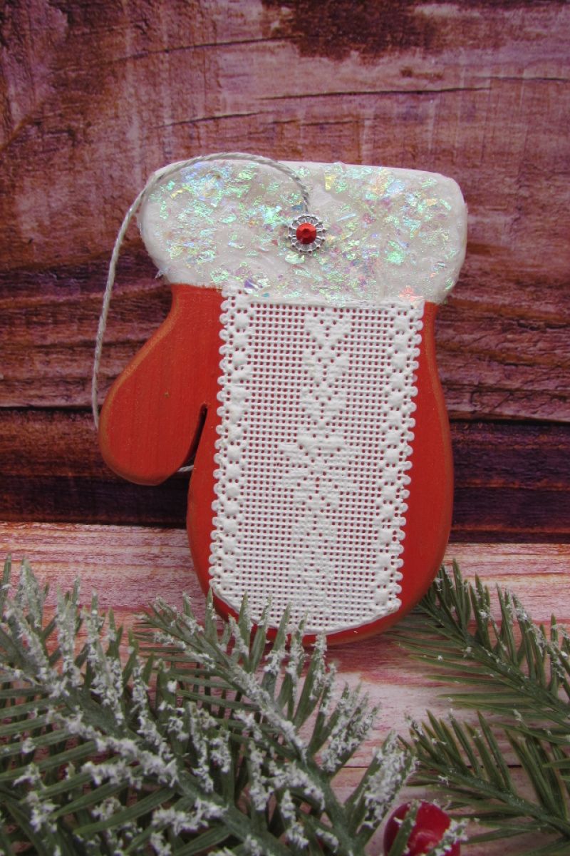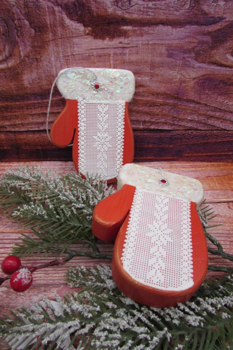 Оригінальний новорічний декор у вигляді рукавички з імітацією вишивки із сосни. Рукавичка декорована з двох сторін. З одного боку гіпка канва, на якій імітація вишивки (зроблено в ручну), з іншого боку виливки ручної роботи. Перчатка має петельку для зручного підвішування. Перчатка покрита лаком з гліттером і багаторазовим покриттям лаком на водній основі, що при попаданні світла надає їй блиску. При декоруванні використовувалися матеріали на водній основі, не токсичні та не шкідливі для здоров'я. В наявності 2 шт.