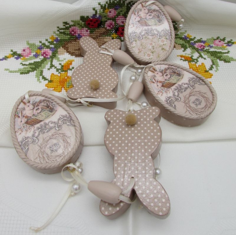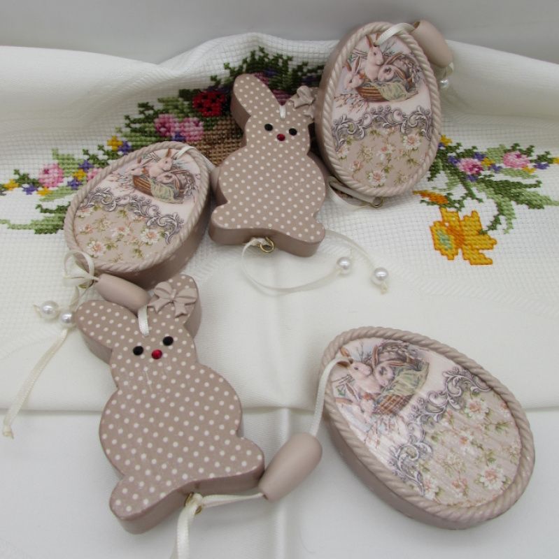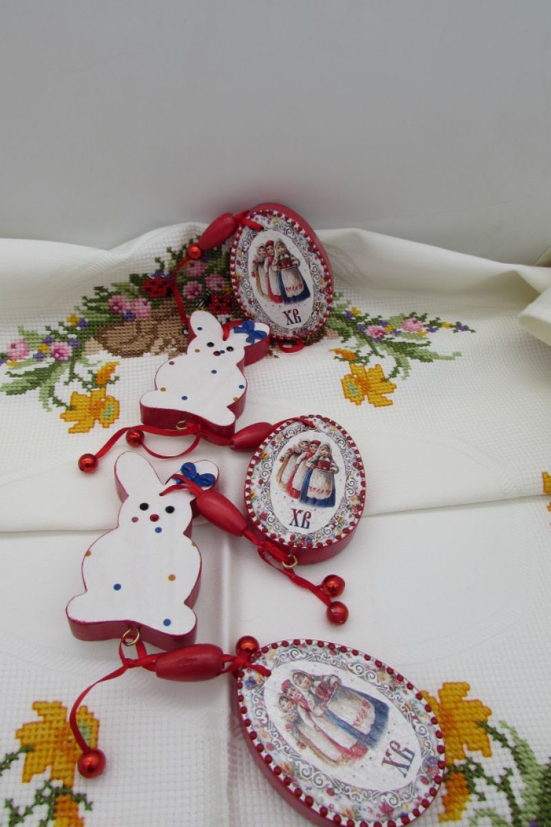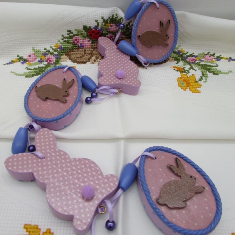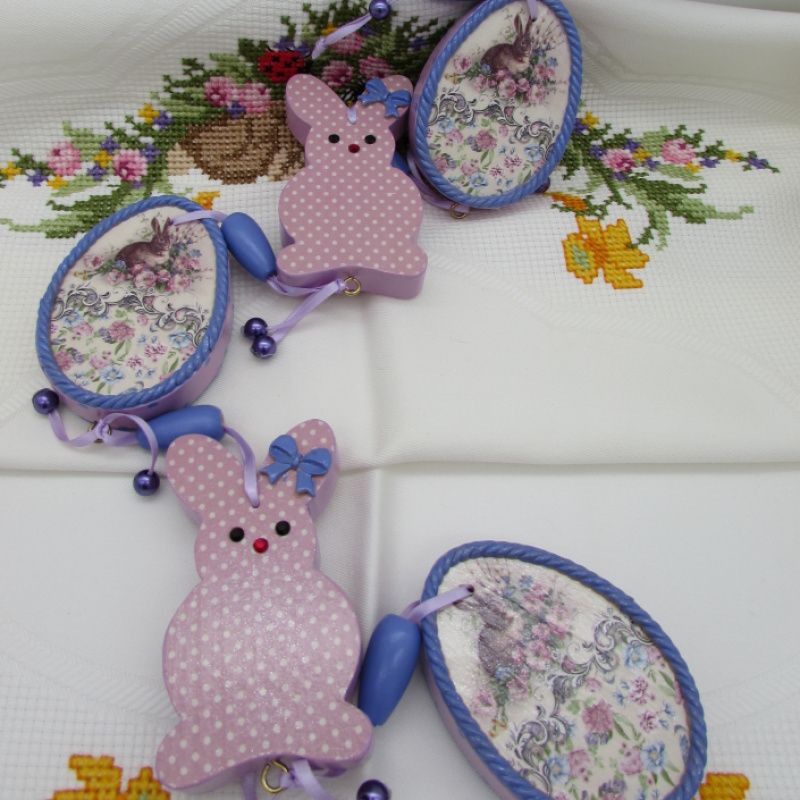 Пасхальна підвіска складається з трьох яєць і двох кроликів. Яйця і кролики декоровані з двох сторін, кріпляться на маленькі гачки за допомогою шовкових стрічок з намистинками. Фігурки розділені дерев'яними крапельками. Всі фігурки з сосни. Така підвіска прикрасить Ваш будинок на світле свято Великдень і буде оригінальним подарунком для рідних і близьких. При декоруванні використовувалися матеріали на водній основі, не шкідливі для здоров'я оточуючих. Довжина підвіски 75 см В наявності 3 шт.