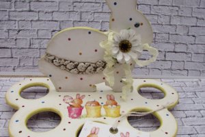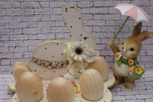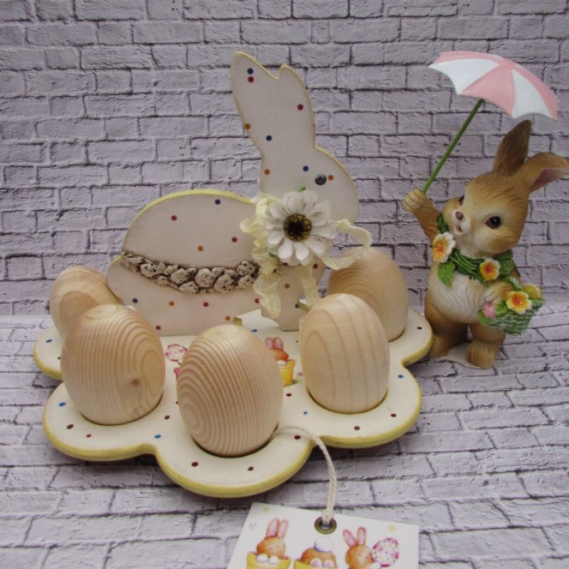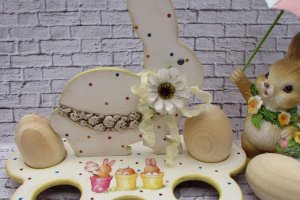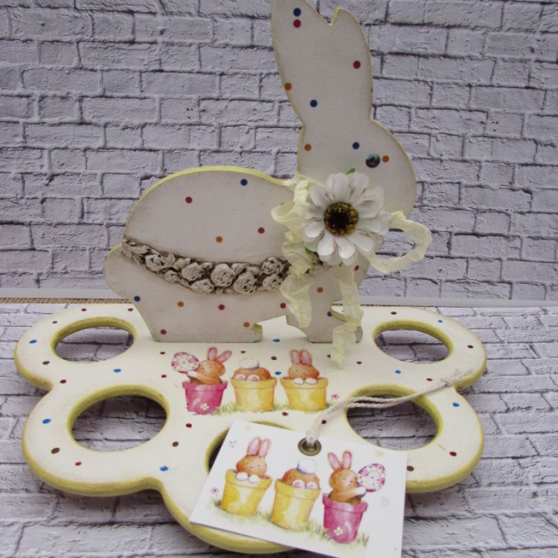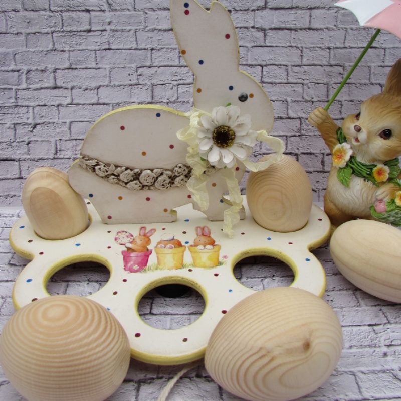 Дерев'яна підставка для яєць декорована в техніці декупаж. Підставка розрахована на 5 яєчок крашанок. Основа підставки має три круглі дерев'яні ніжки. Така підставка прикрасить пасхальний стіл, буде оригінальним подарунком для рідних і близьких. При декоруванні використовувалися матеріали на водній основі, не шкідливі для здоров'я оточуючих.