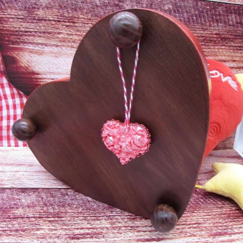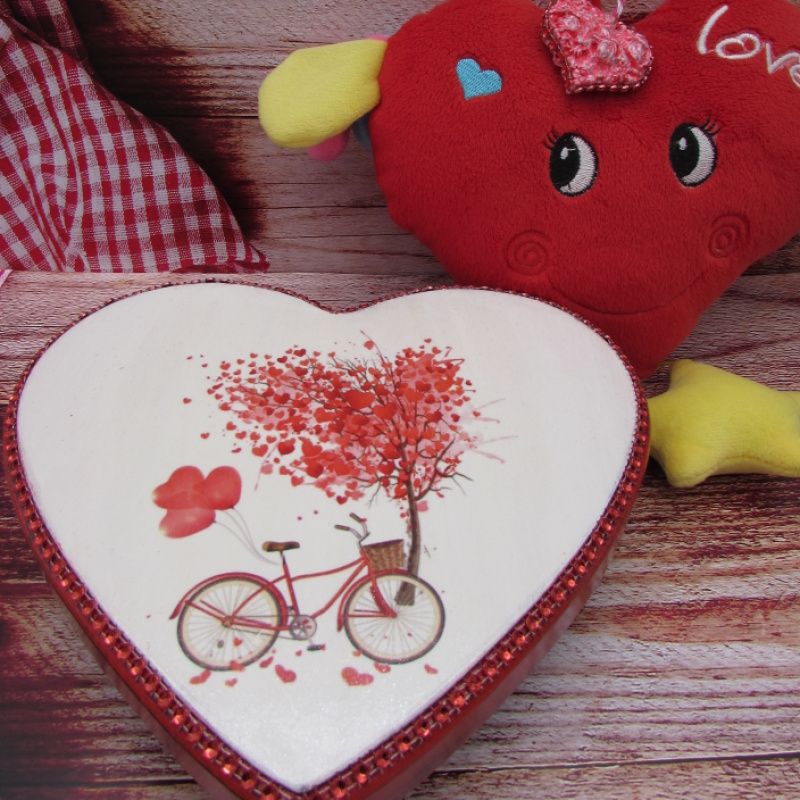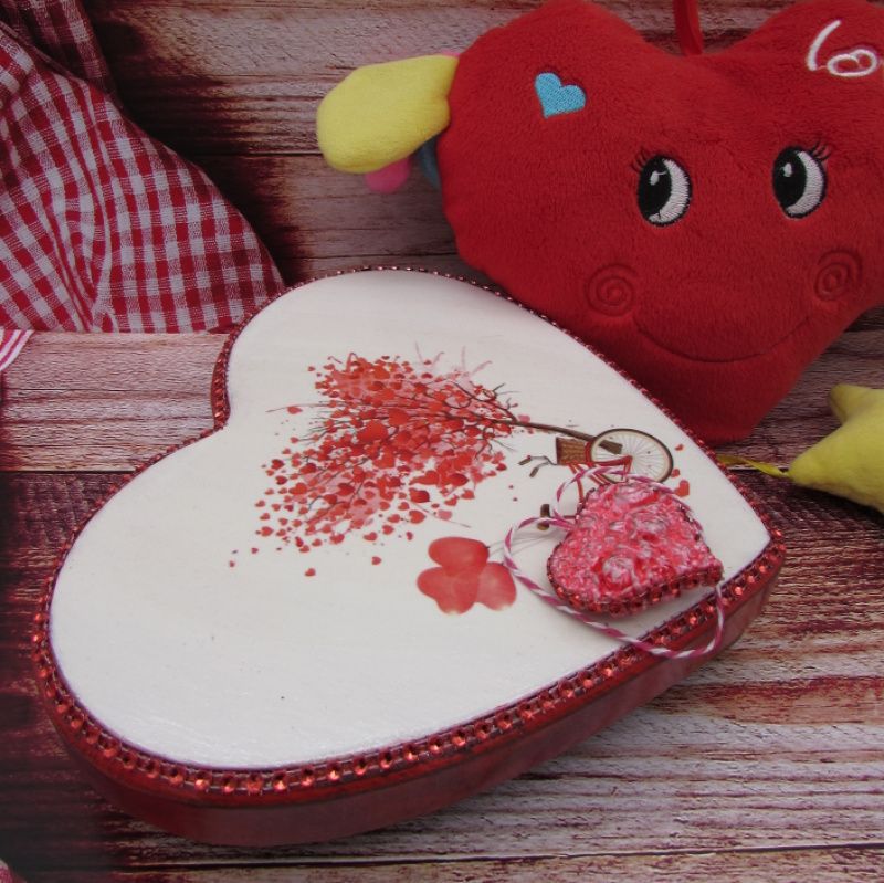 Столик з вільхи, декорований у техніці вживлення картинки. Столик має три круглі ніжки, прикрашений по краю стрічкою з імітацією страз. Такий столик буде чудовим подарунком на День закоханих. На нього можна поставити міні свічку, чашки з чаєм і провести романтичний вечір з коханою людиною. До столика додається міні-серце з виливка ручної роботи.